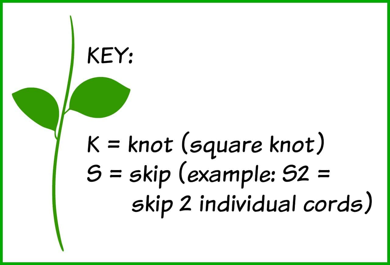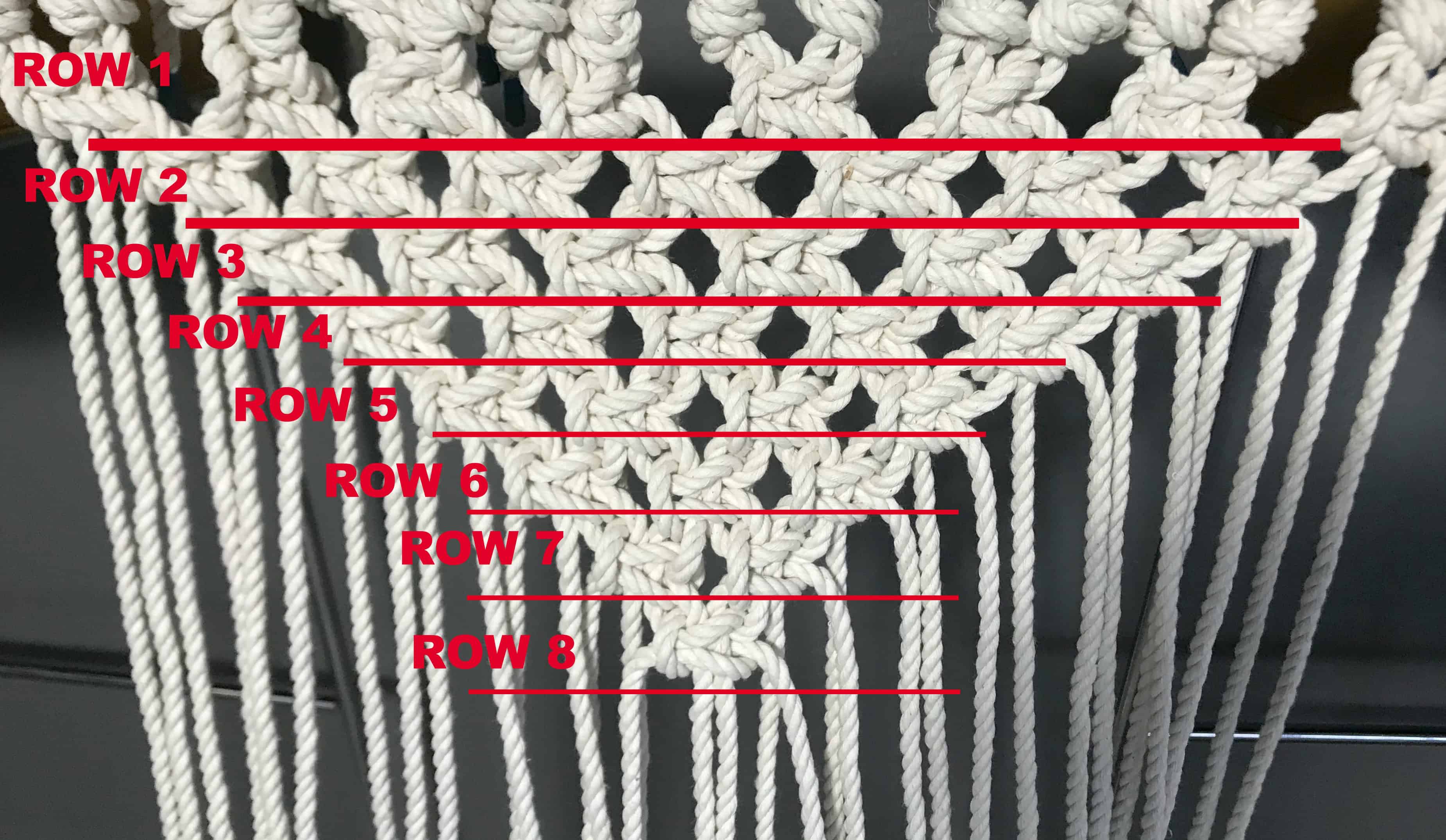 - row 3: starting with 5th individual cord from the left – 6K (6 Square Knots)