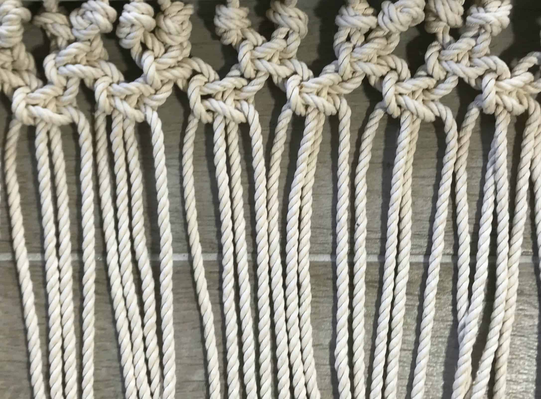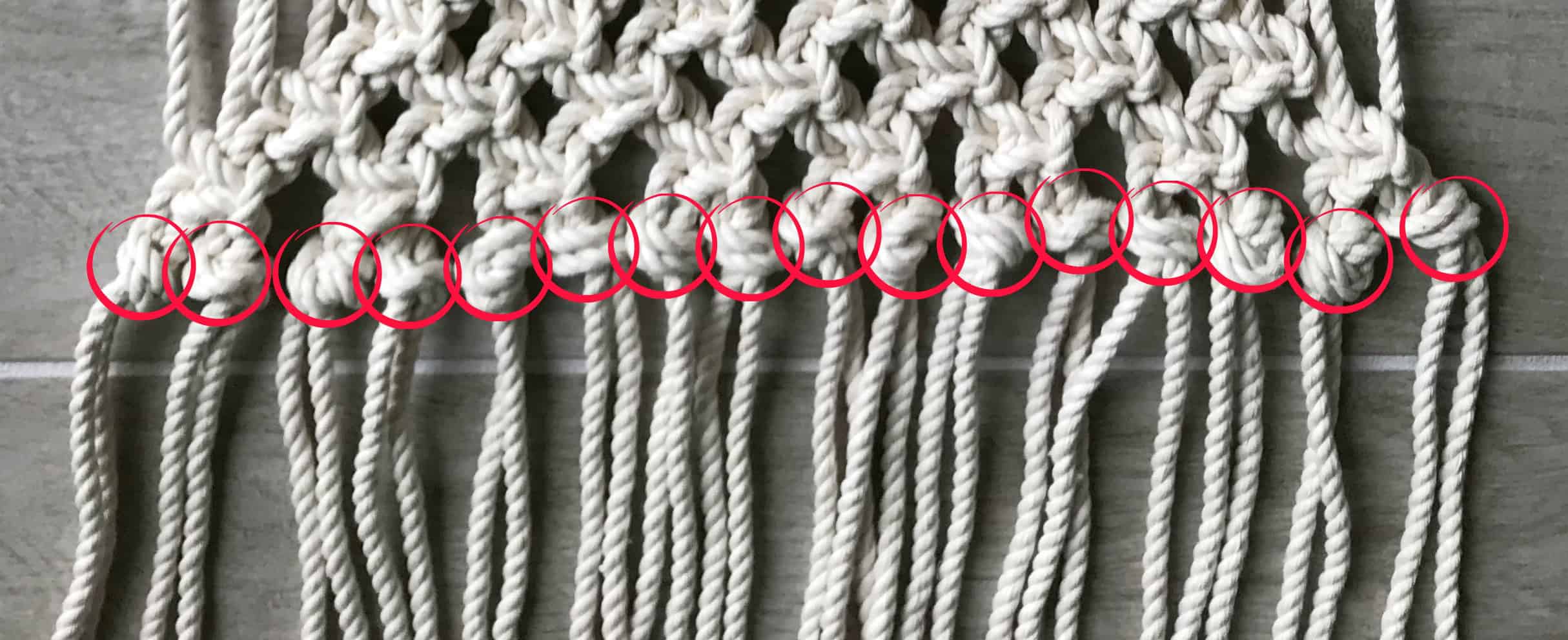 Directly beneath your last row of Square Knots, starting with the first 2 cords on the left, tie a regular knot. Continue tying knots until you have 16 secure knots.