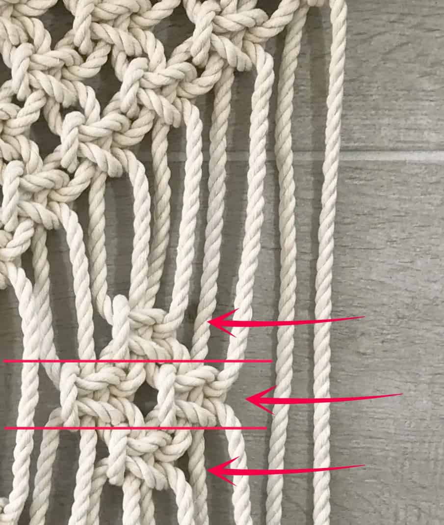 About 2″ down from the bottom of the full diamond, make a row of Square Knots. (Starting with the 1st individual cord on the left, make 8 Square Knots.