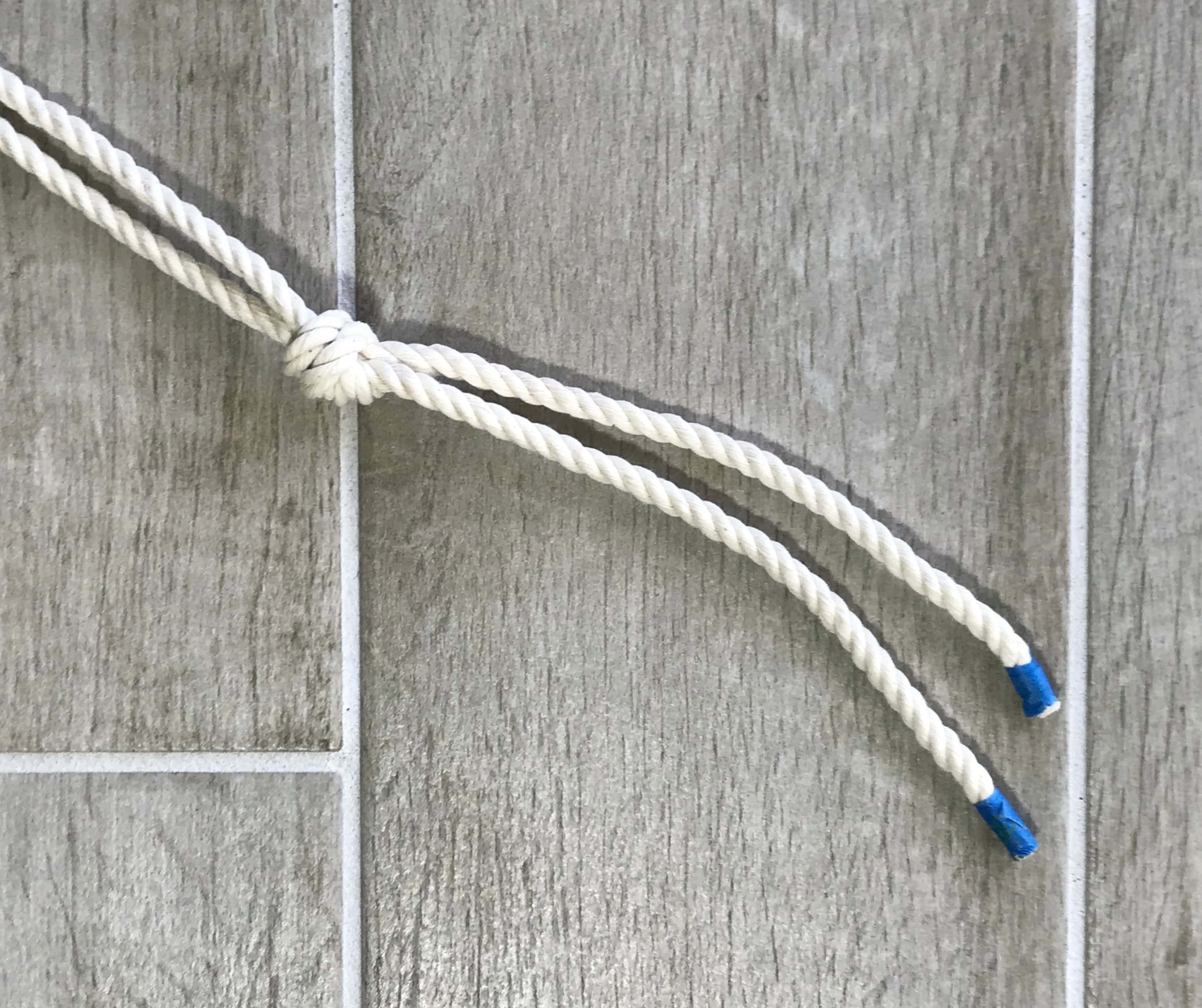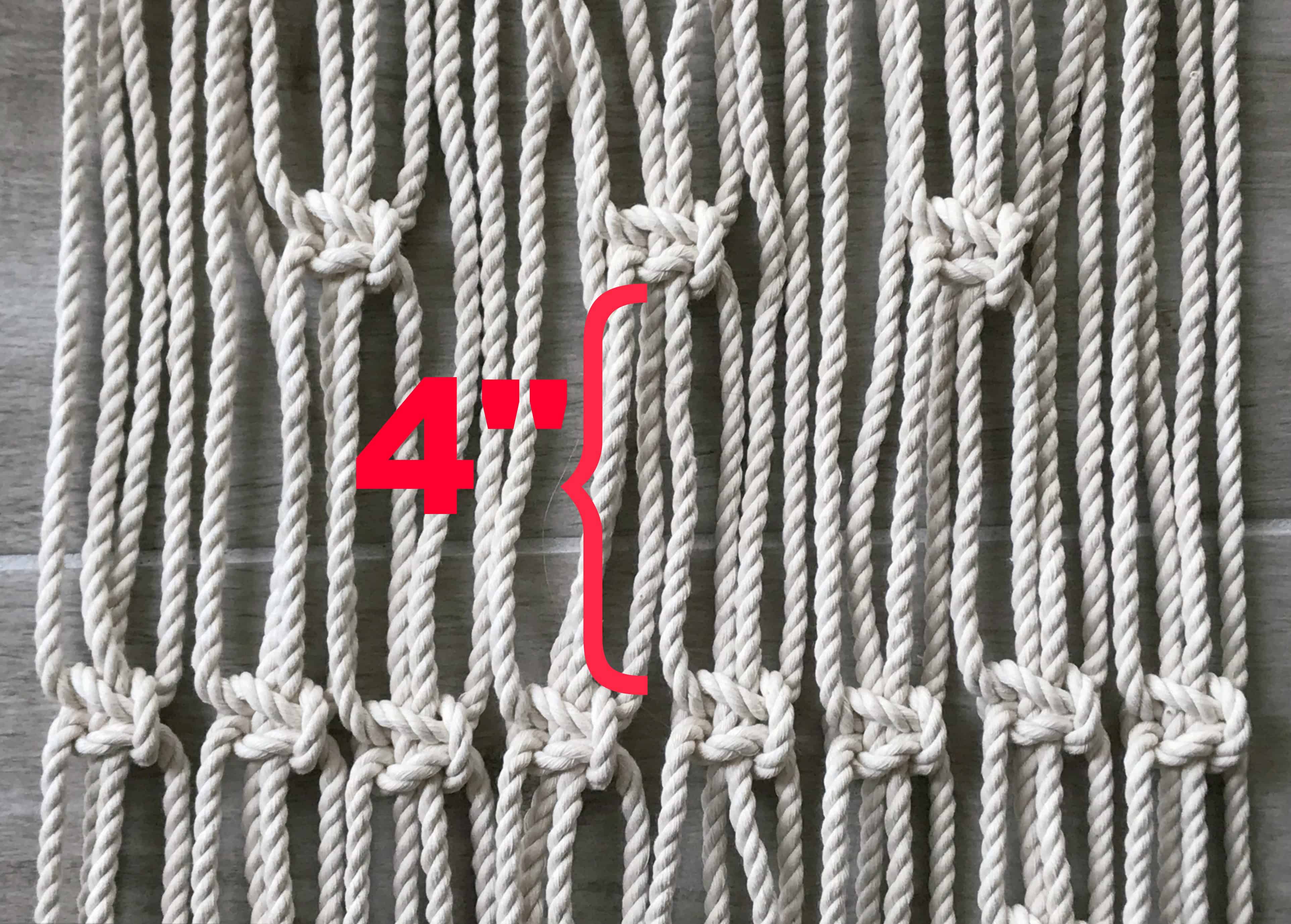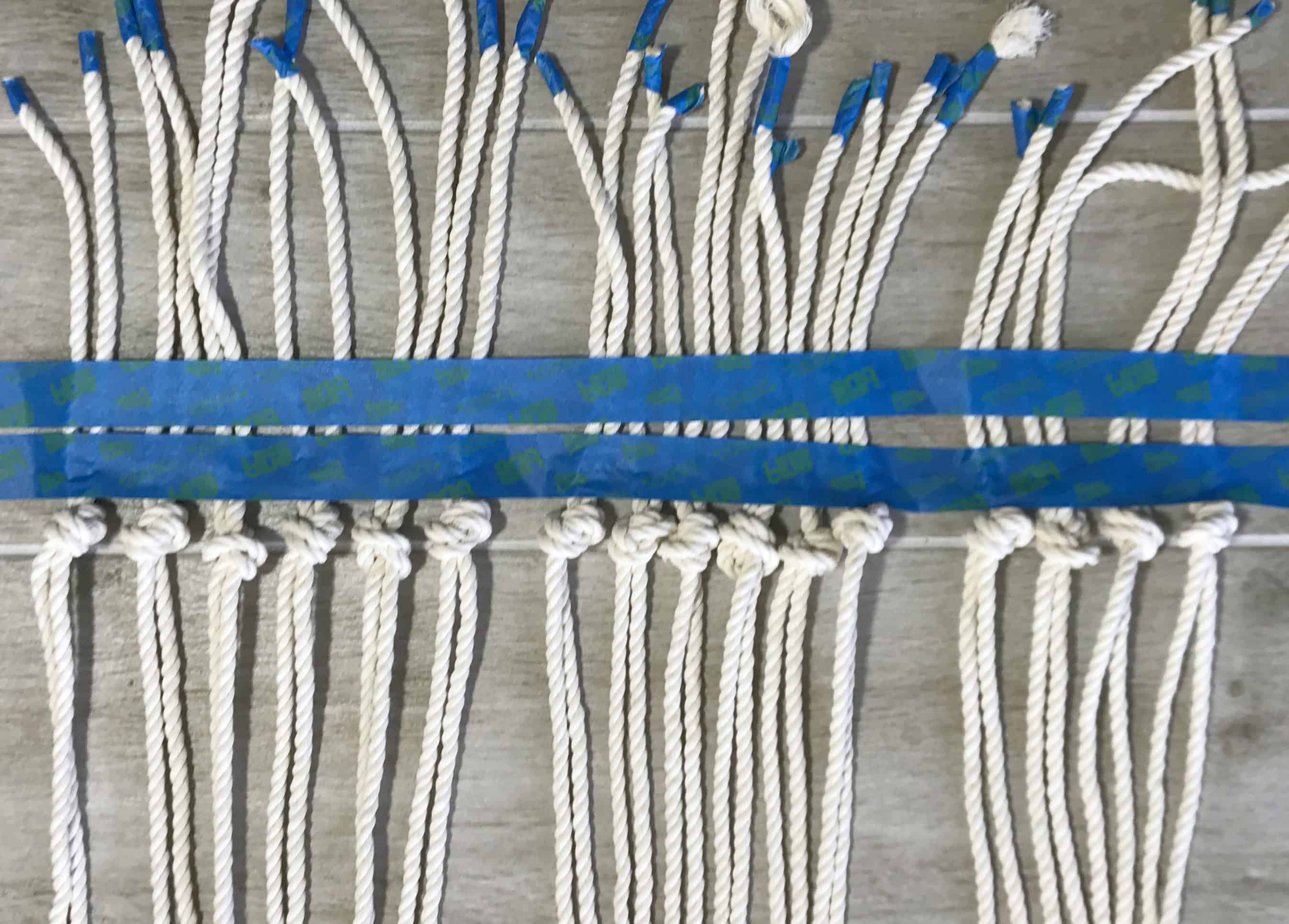Cut 32 pieces of rope, each measuring 12 feet. Wrap a small piece of tape around both ends of each pieces of rope, to prevent fraying. Next, tie pieces of rope together (as shown in photo below), with the knot about 10 inches from the rope ends.