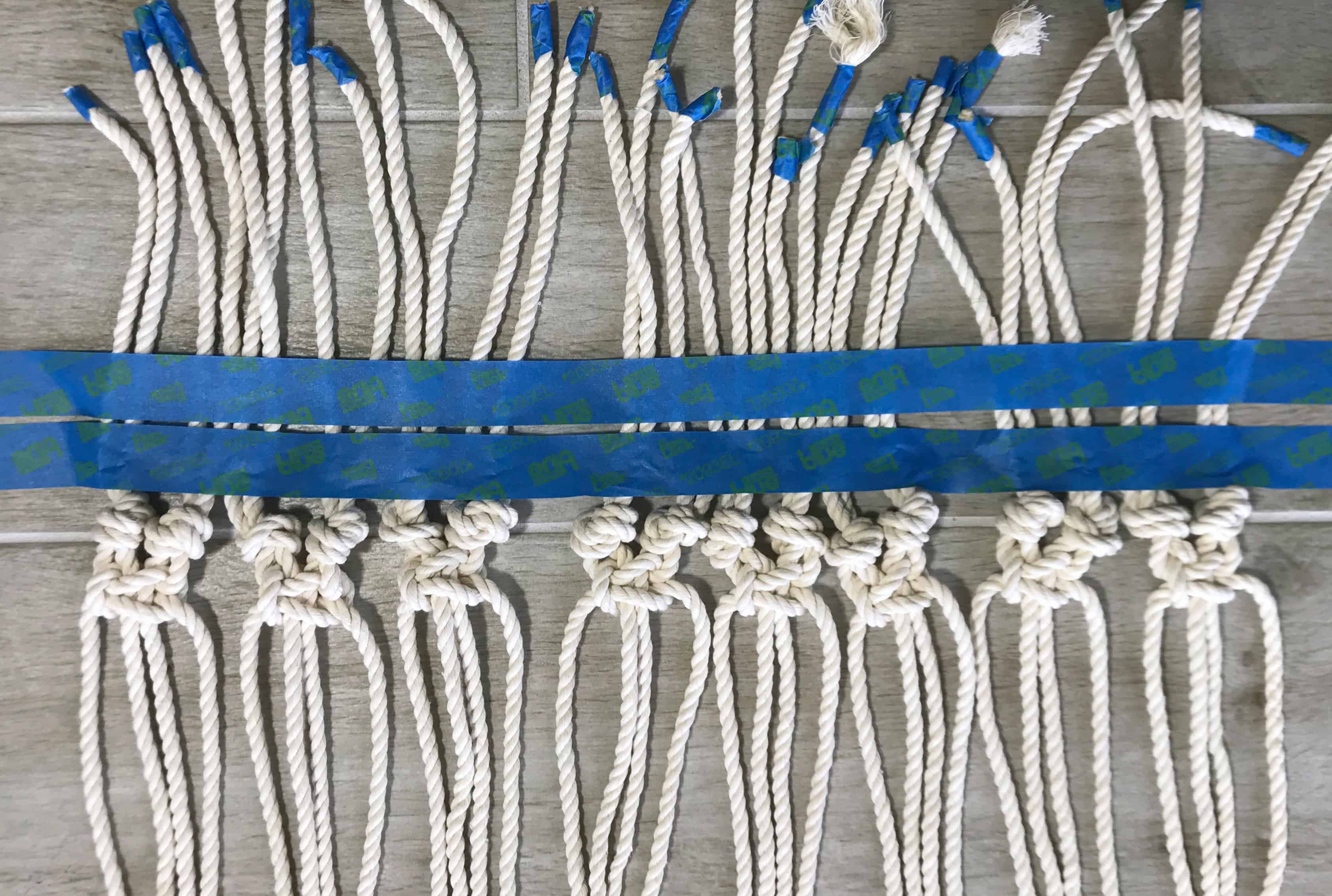 Do this for all the pieces of rope, so you will end up with 16 knotted pieces. Lay them evenly on a flat surface and tape the ends down to keep steady.