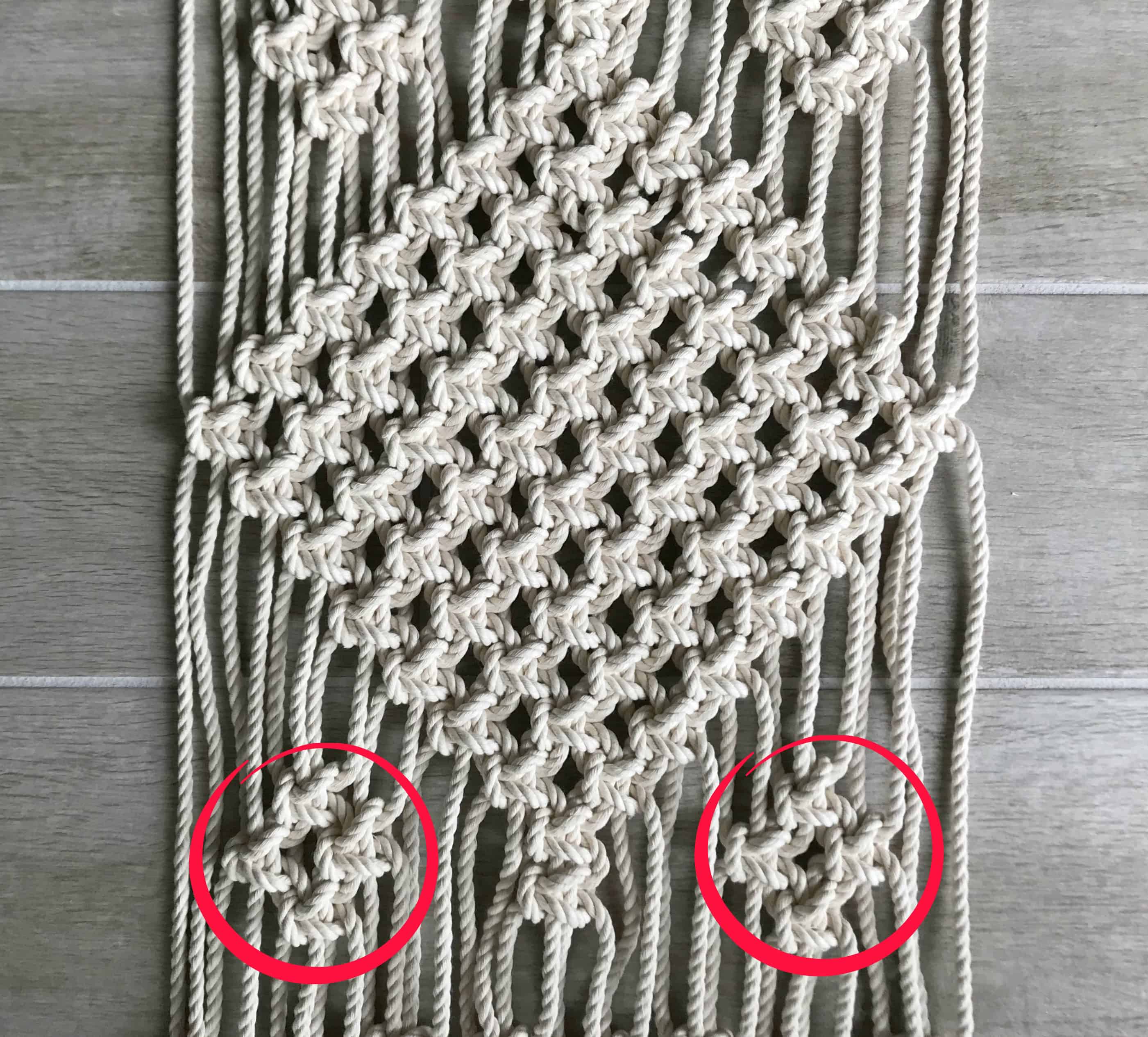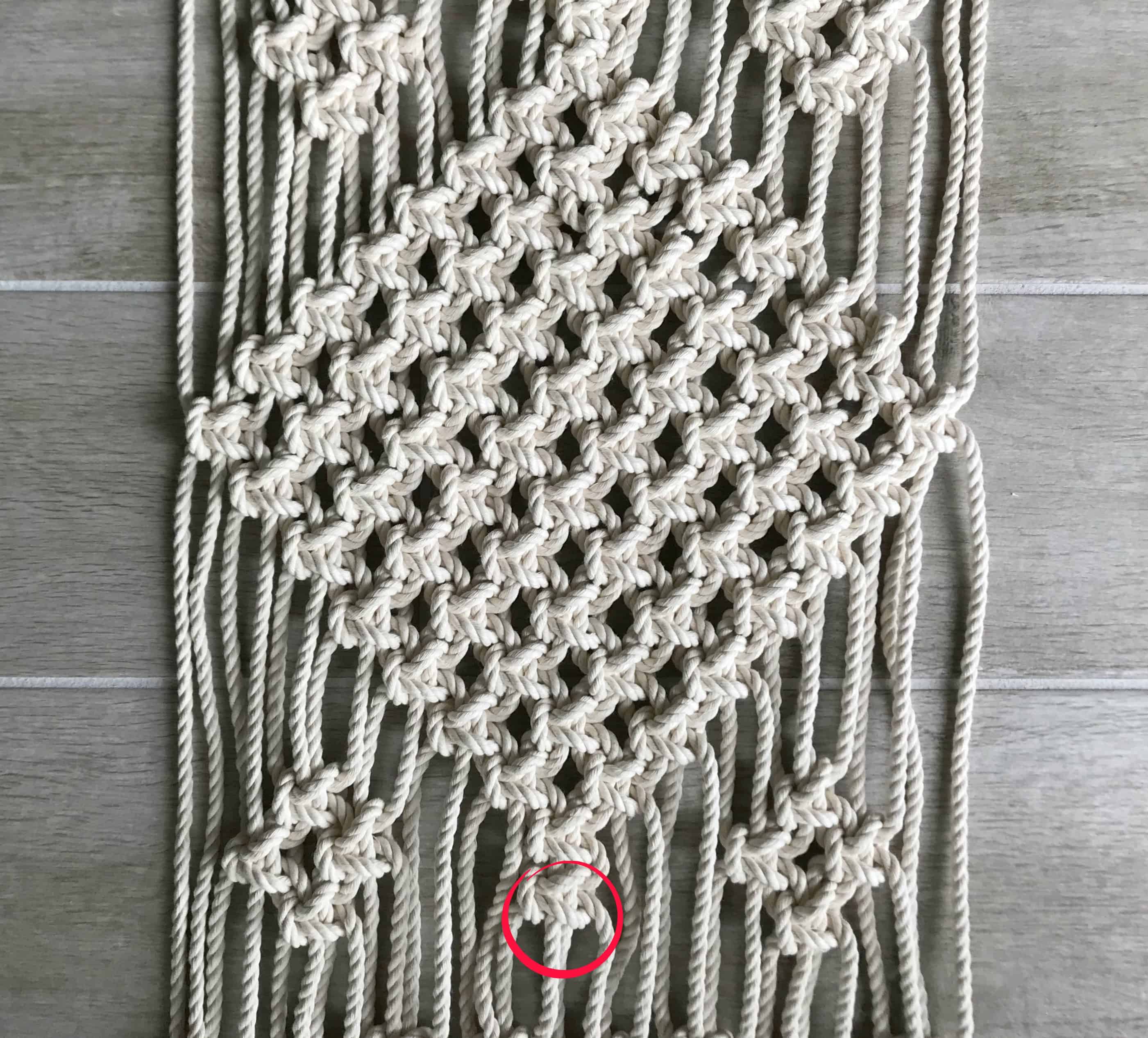 - row 1: starting with 15th individual cord from the left – make one Square Knot (You can see that this knot is directly beneath the last knot on the previous half diamond design.