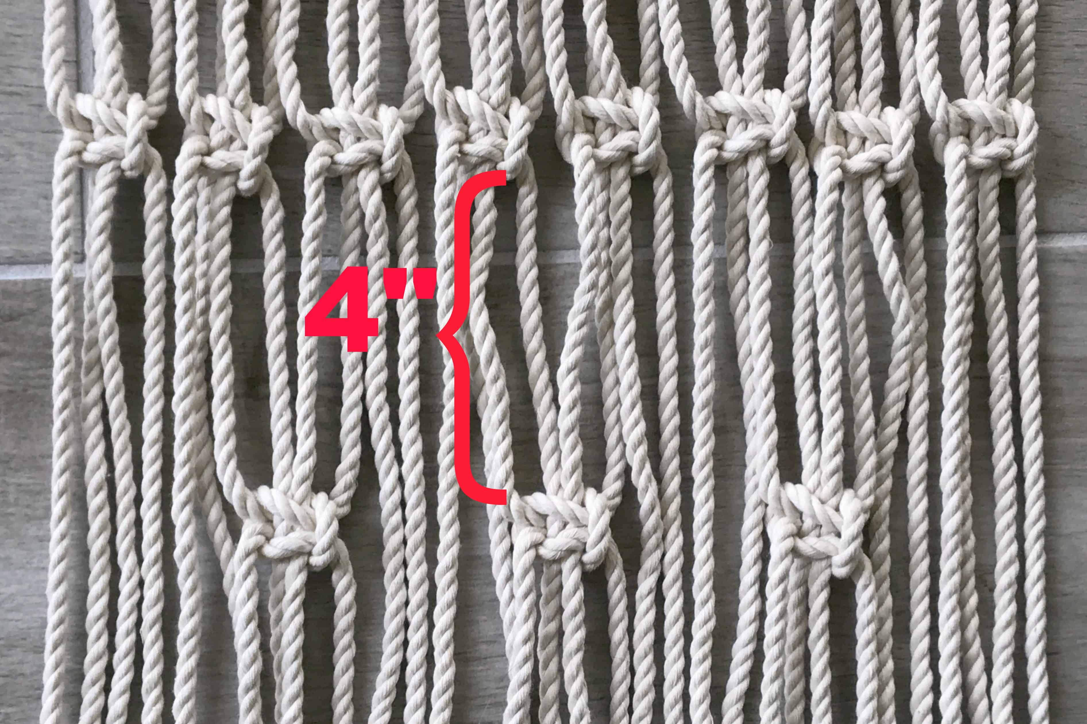 Next, skip down about 4″ from the last row of Square Knots. Starting with the 7th individual cord from the left, make a Square Knot – skip 4 cords – make a Square Knot – skip 4 cords – make a Square Knot – skip the last 6 cords.