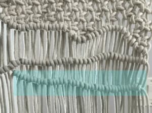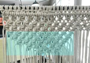 Normally, my macrame patterns include row by row instructions. However, this pattern is a bit more free form, and it is easier to work in sections than horizontal rows. It is also more forgiving if you miss a knot or make a small error. Now that you have 3 rows of Square Knots, continue adding more Square Knots and Alternating Square Knots to the left side of the tapestry, creating a round dipping form as shown in the photo below.