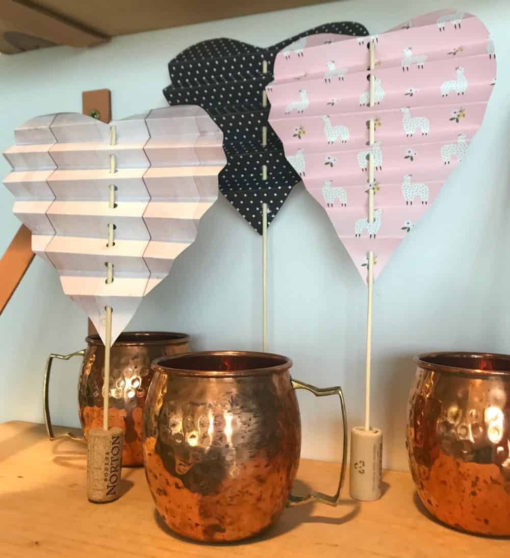 Insert the pointed end of a wooden skewer into a wine cork. Thread the skewer through the punched holes in the paper heart. Hold in place with a small dab of hot glue at the top back of the heart and again at the bottom back of the heart. These little accordion hearts make a fun addition to Valentine’s Day decorations as well as wedding showers and other parties.
