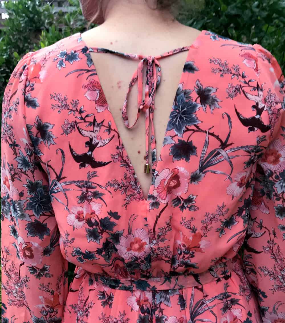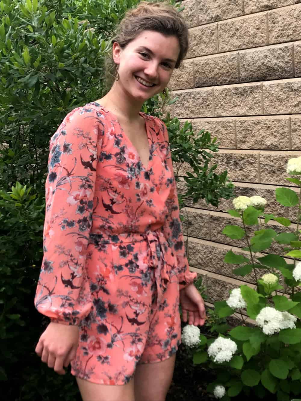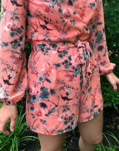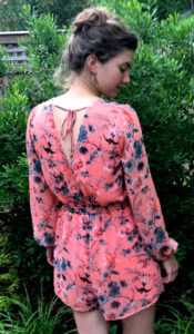 I know what you’re thinking. How can a romper be elegant? Everything about the concept of an adult onesie screams playful, whimsical, run-around-and-have-fun. But Lilly proved me wrong. She wore an adorable playsuit in a summery romantic print. Made from chiffon, the fabric draped her silhouette beautifully, and the detailing on the back gave it an air of sophistication. And get this – it’s machine washable!