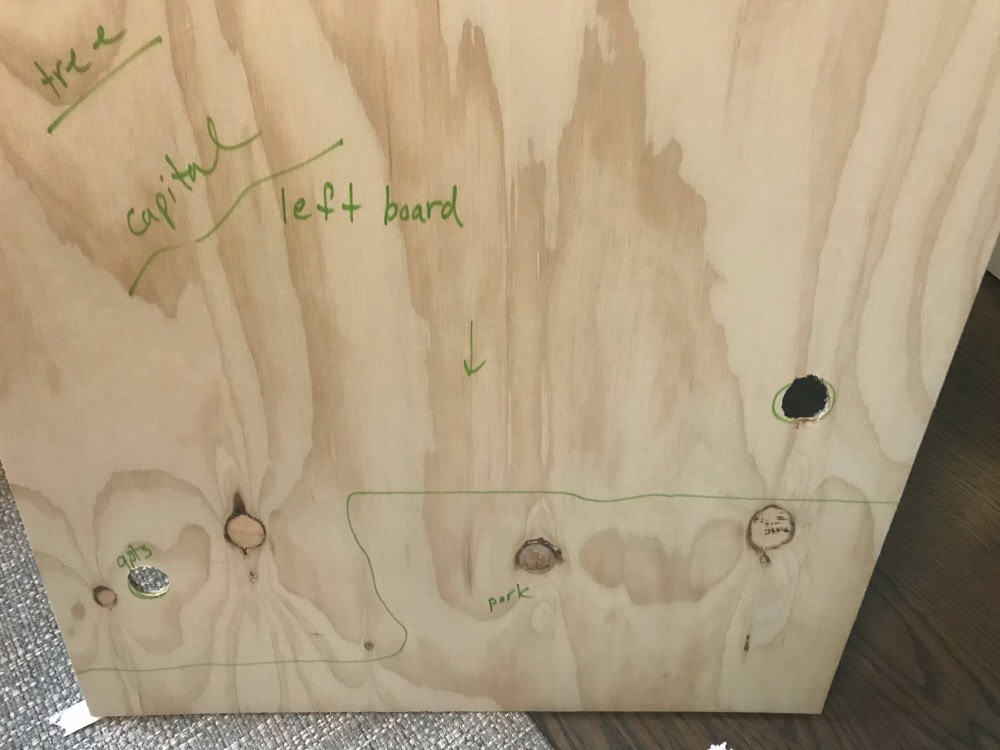 Once you have an idea of building placement, mark where you will need holes drilled for the electrical cords. Start with the buildings on the ground level (that rest on the bare wood, not foam). Underneath each building, draw a circle where a hole is needed. Be sure to mark the name of the building on the wood for future reference.