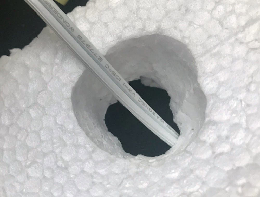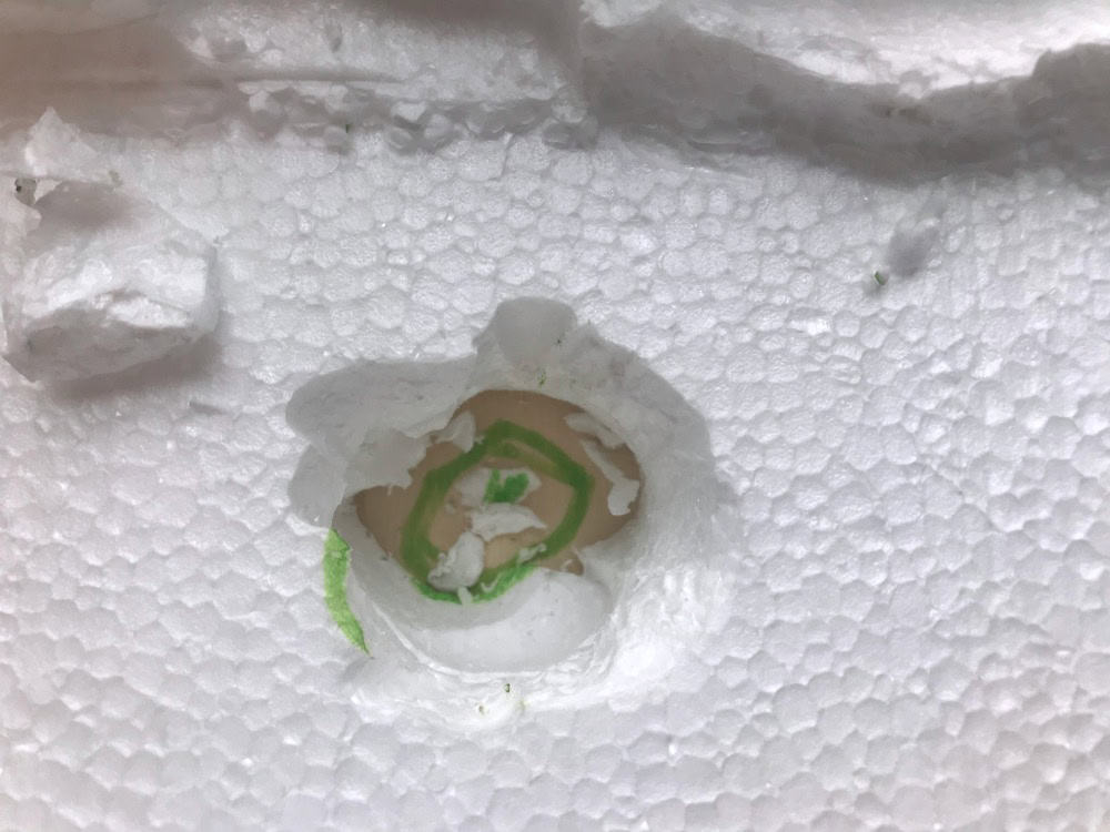 For those houses on level 2, after a circle is drawn onto the foam, use the sculpting tool to carve a hole through the layers of foam. Next, draw a circle (for drilling) onto the wood directly beneath the foam hole.