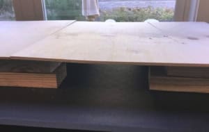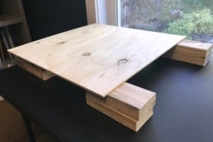 I aslo had Home Depot cut a few wooden blocks to use as risers. These should be stacked to at least 3″ high to allow ample room for cords. Now all my electrical infrastructure can easily be concealed, with only one cord (from a surge protector) plugged into the outlet beneath the table.