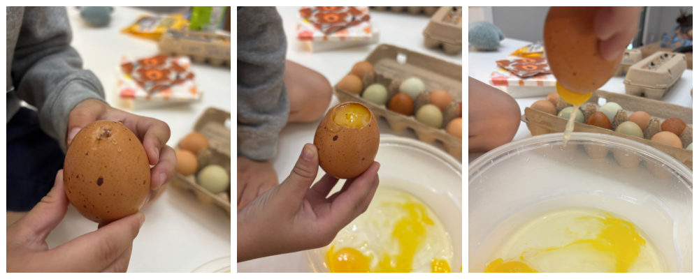 I began by tapping one end of the egg with a spoon, creating a small crack. Using my fingers, I enlarged the opening. Then I gently shook out the contents. (And yes, we will have breakfast for dinner tonight!)