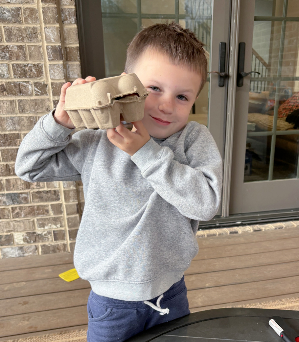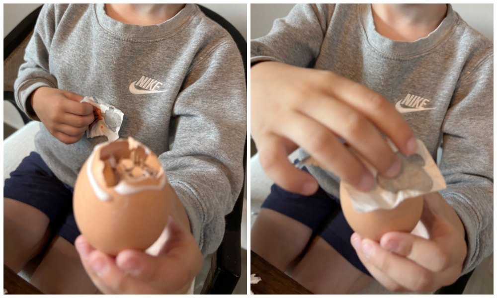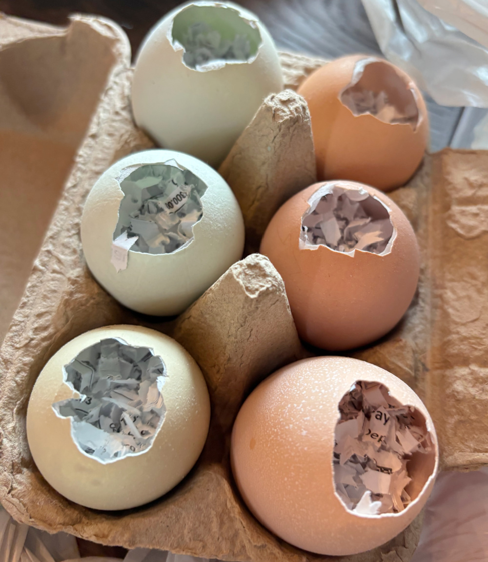 Liam was more interested in filling the egg, so he skipped the decorating part. However, personalizing them with craft paint or felt tip markers can be great fun for kids. They can also make their own confetti with hole punchers and construction paper. I made a practical choice to just use contents of the paper shredder in my husband’s office.