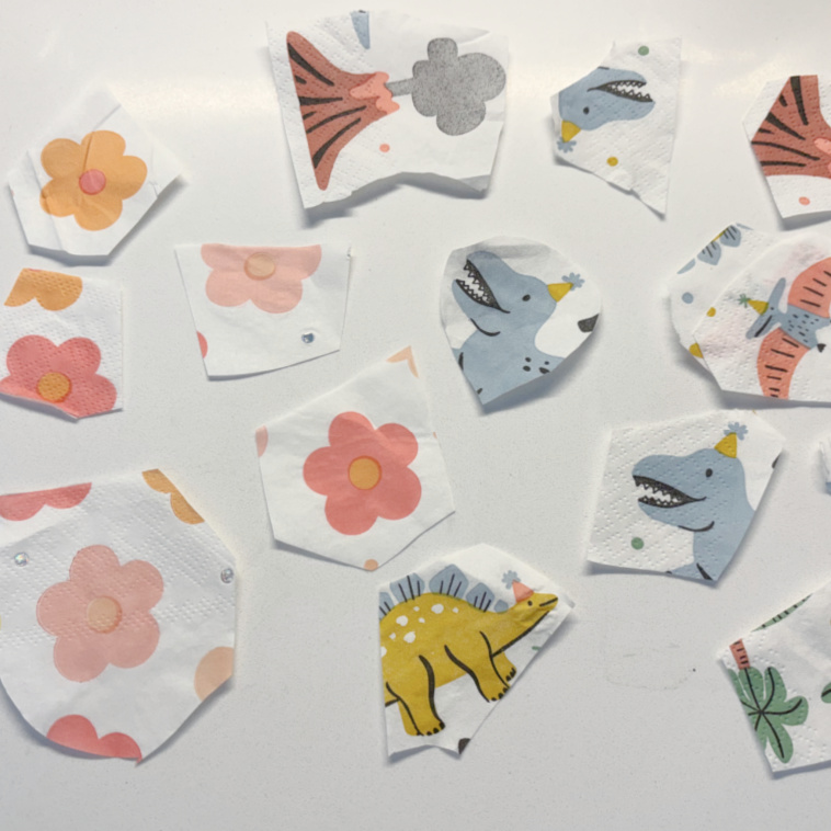 Liam and I used playful paper napkins to cover the ends of our cascarones. We cut (and sometimes tore) little irregular pieces from the napkins.