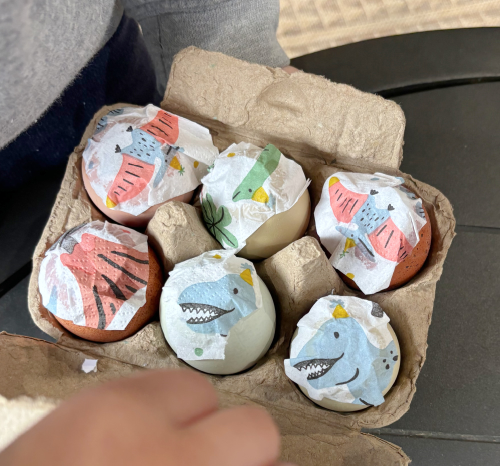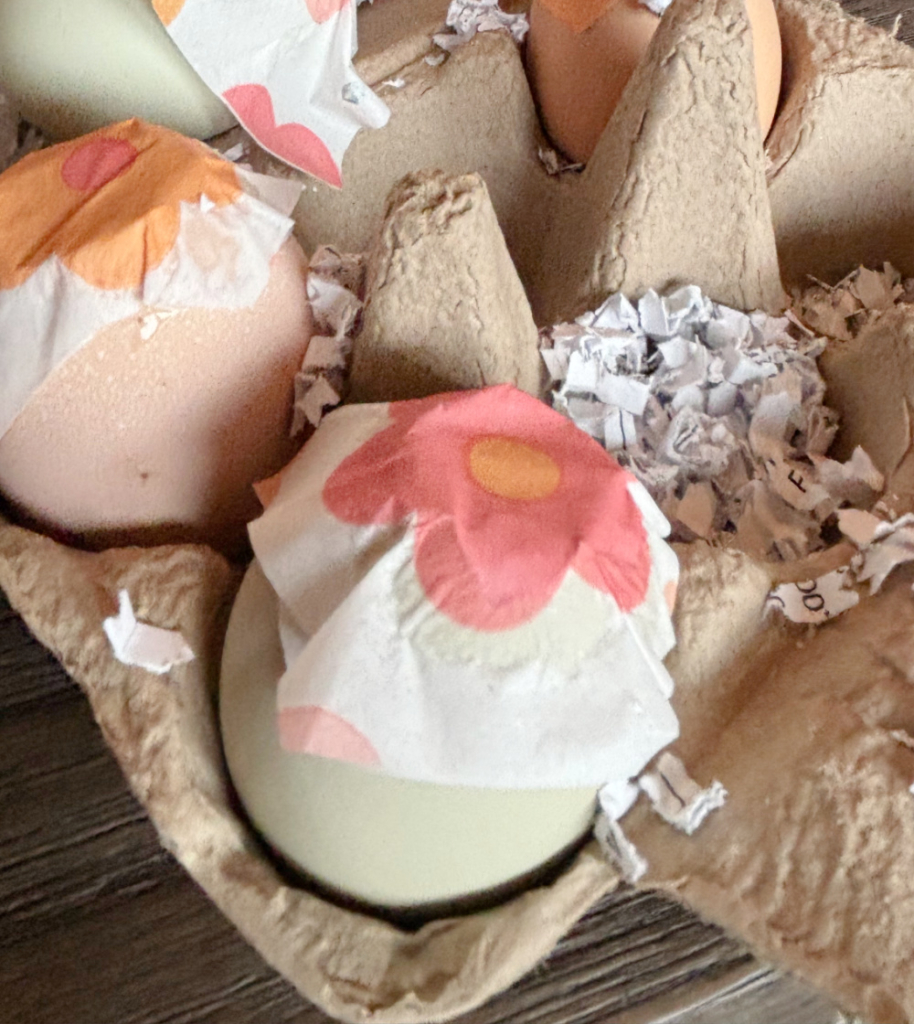 Once the eggs were filled, we used Elmer’s glue to stick the napkin pieces over the openings. Let dry.