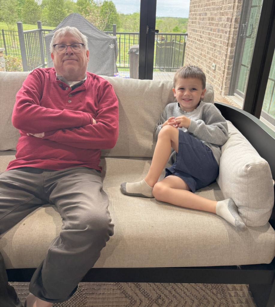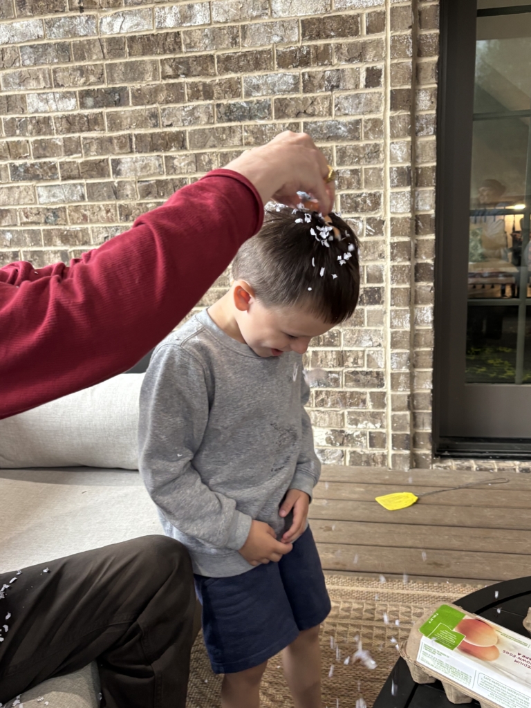 Finally, time for our celebration. And what’s our occasion? Why, cracking eggs over Pop’s head, of course.