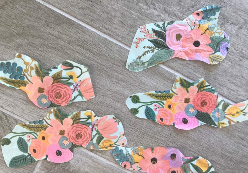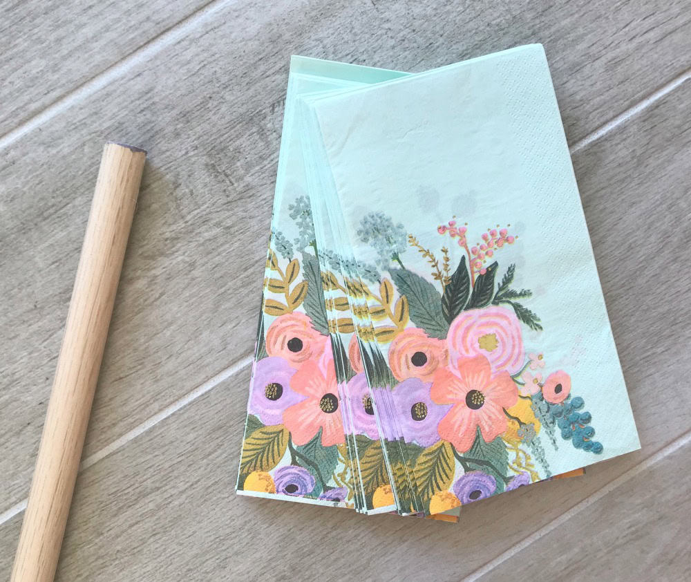 My current design company crush is Rifle Paper Company, so naturally I selected their Garden Party napkins for this project. I cut flowers from the napkins in random shapes. No need to be precise, because a free-spirited, random placement of the designs onto the pole is lovely. I even like for a bit of the wood to show.