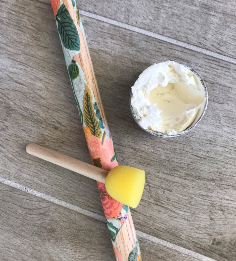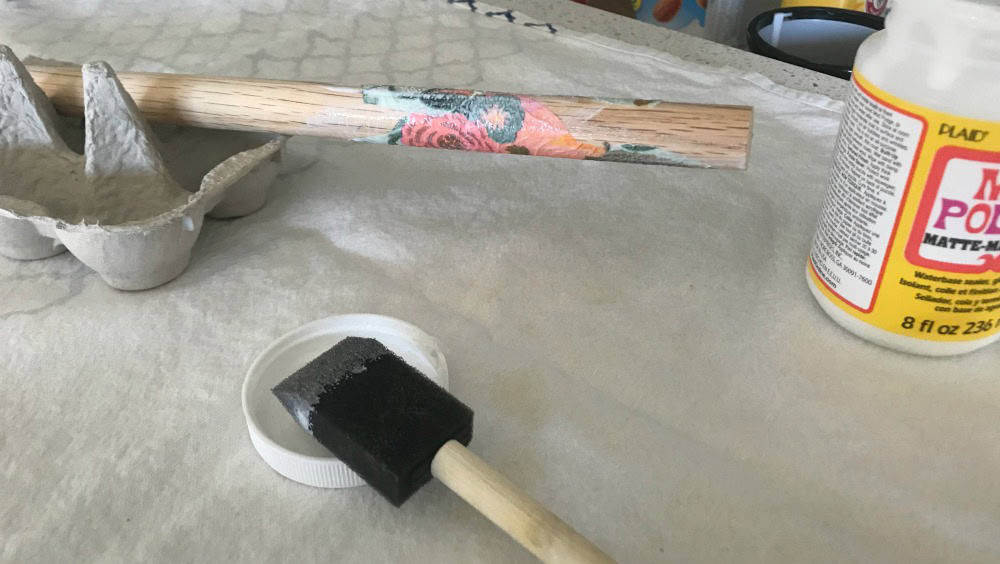 I applied a thin coat of Mod Podge onto a small segment of the pole. Then I applied the first floral design and smoothed it out gently with my fingers. Next I gave it a generous coat of Mod Podge. I repeated this step until the entire pole was covered. A bit of overlapping is fine, and so is leaving a few spots of bare wood. Let the pole dry completely.
