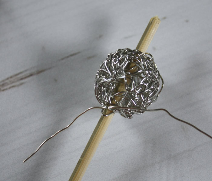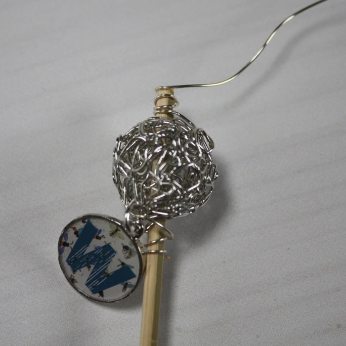 Next run the dowel through a large wire mesh bead. Then thread a piece of 22 gauge beading wire through the bottom of the bead and twist it around the dowel. Add a personalized letter charm to the other end of the wire, then run the end back through the mesh wire bead.