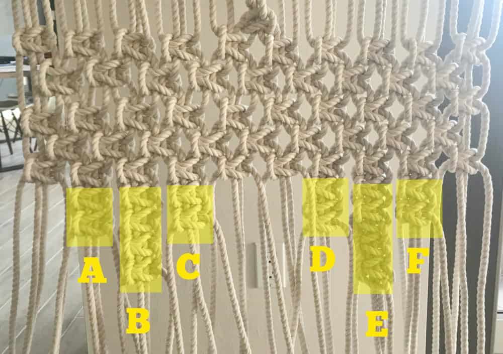 Row 10 – For this next section, refer to the photo below. Starting with the 5th individual cord from the left, add two more vertical Square Knots (as shown in section A). Then add 4 more vertical Square Knots in the next column (section B), and 2 more vertical Square Knots (section C). Now skip 8 individual cords. Continue in this fashion: add 2 more vertical knots to columns D and F, and add 4 vertical knots to column E.