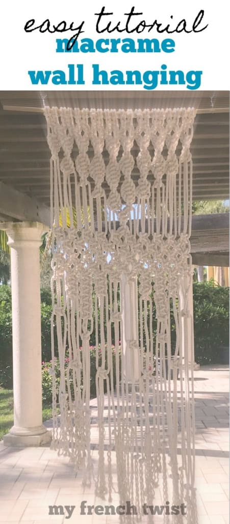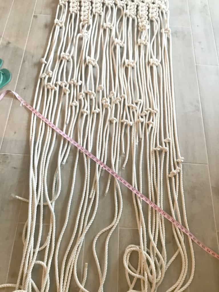 Lastly, tie random small knots in each individual cord. Then trim the bottom in an angled slant. Fray the ends. The finished size of this simple but stunning macrame wall hanging is 30″ wide x 88″ long.