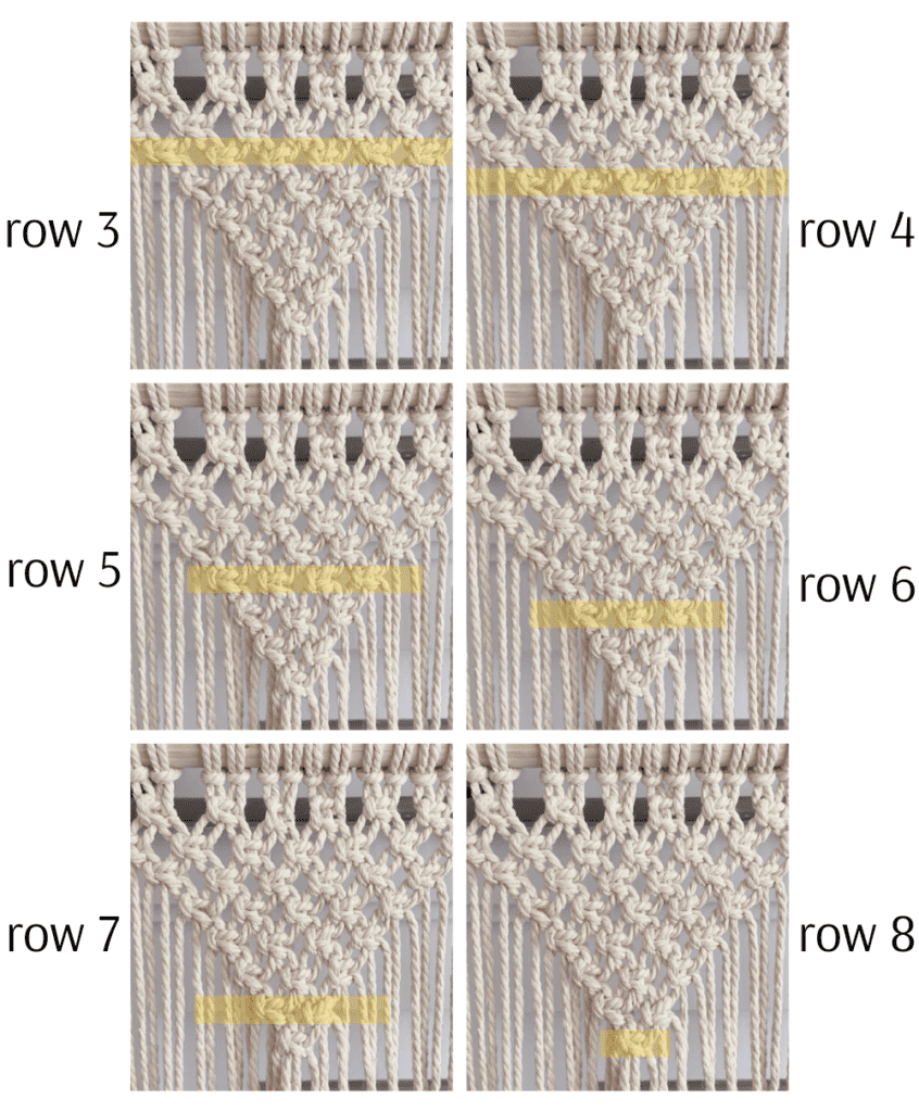 Row 4 – Beginning with the third cord on the left, make a row of 8 Square Knots.