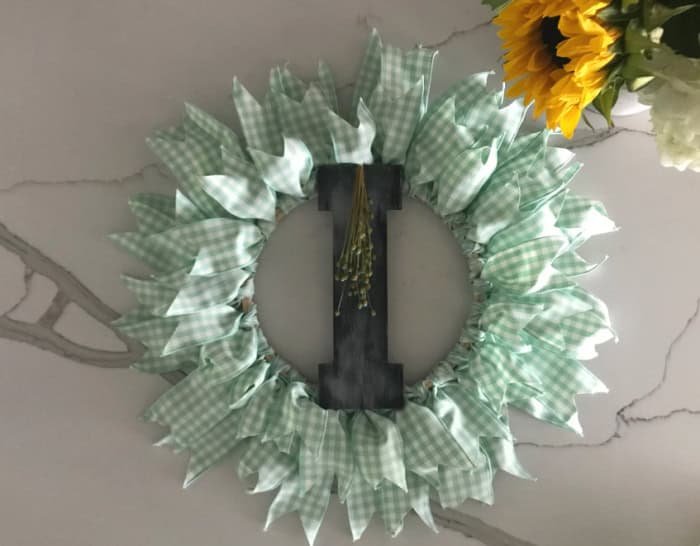 Using a hot glue gun, attach the wooden letter to the center of the wreath. I added a small cluster of dried flowers as an extra embellishment.