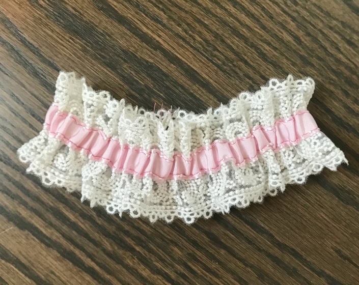 When done, stitch over the back seam to keep the elastic secure. Then stitch again for extra security. Trim away any loose threads and extra ribbon ends. Turn the garter right side out.