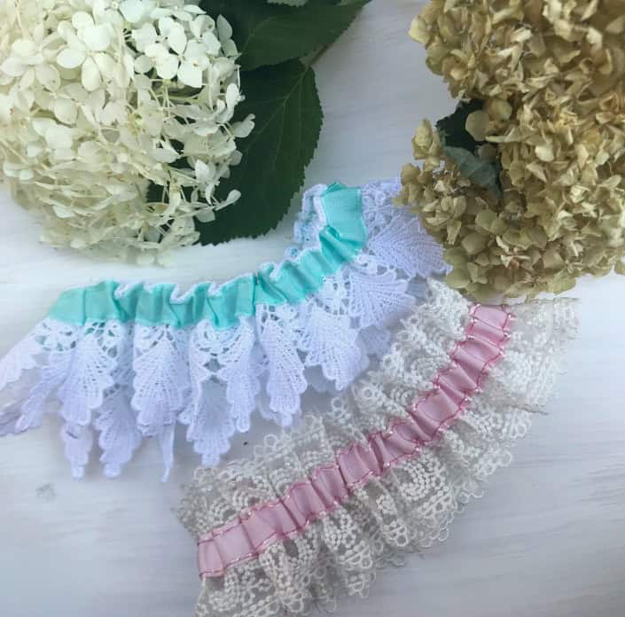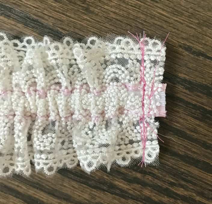 Using a safety pin attached to one end of the strip of elastic, insert it into the casing (between the ribbon and the lace). The lace will begin to gather as you guide the elastic through.