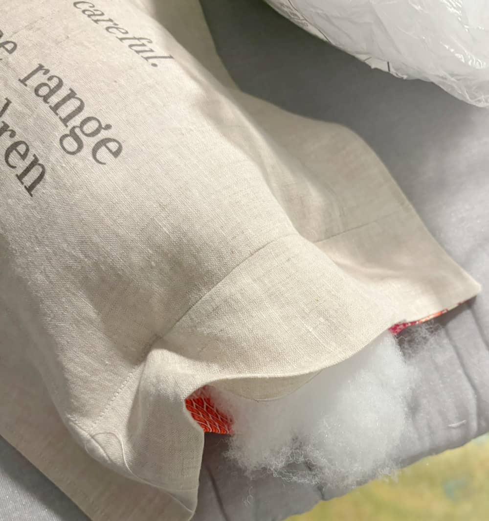 Add stuffing to the inner pillow through the side opening, making sure it is distributed evenly and well into the corners. Stitch the inner cavity closed, then stitch the edge closed.