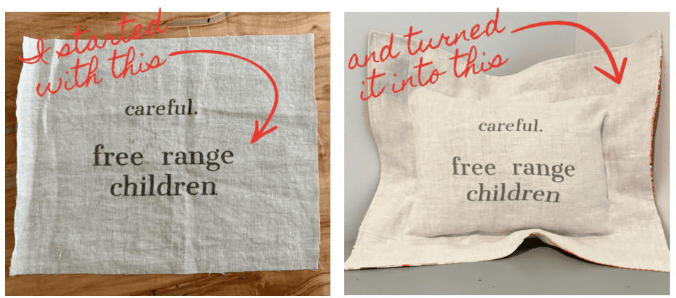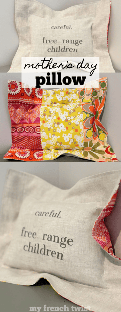 A final word – I can’t wait to gift this pillow to my young friend. She’s the mother of two little boys. On any given day, she can be found helping them finger paint, marching them through mud puddles, or peddling them around town in her bunch bike. And here’s to all the moms of free range children who are making the world a better place.