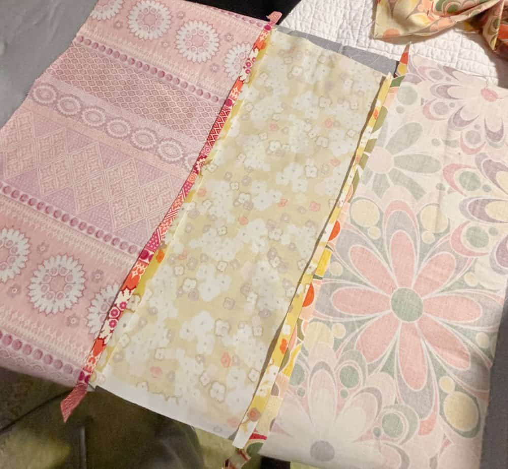 Sew 3 strips of colorful fabric remnants together to form a piece a bit larger than the pillow front. Press seams open.