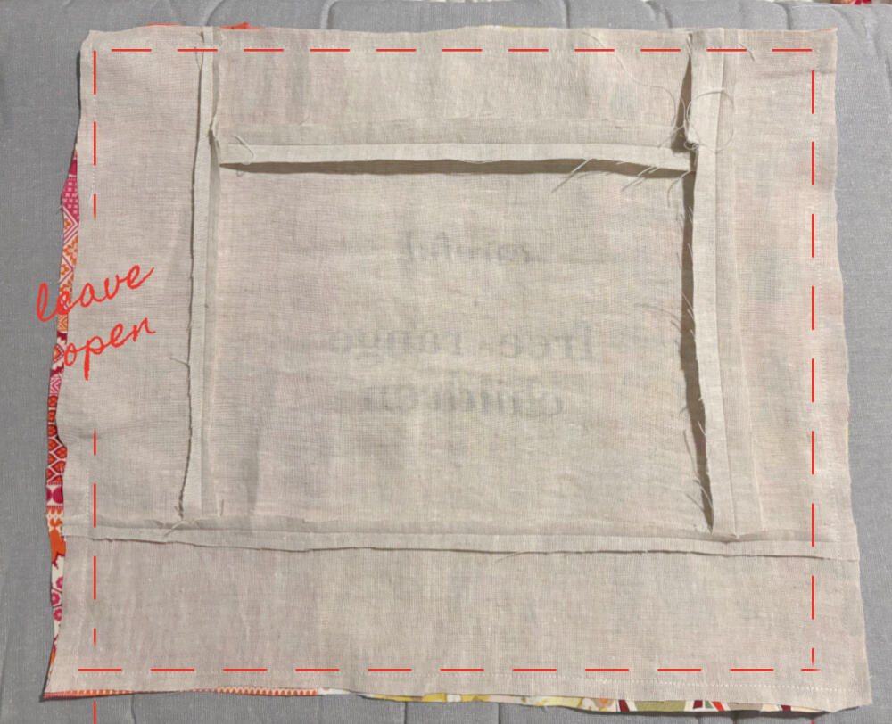 Stitch along the seam lines of the inner front pillow, as shown below, leaving the gap open.