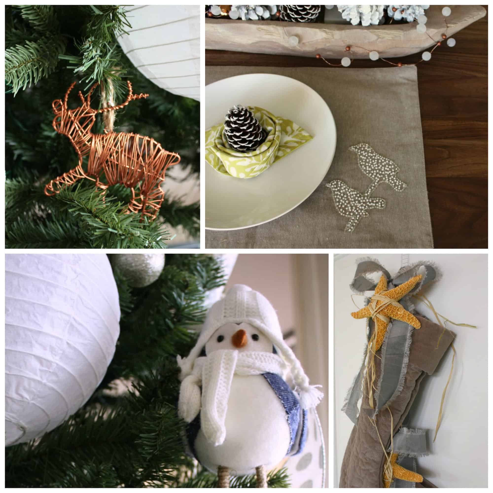 A copper moose theme emerged, woodsy place setting, snowbird tree, coastal stocking.