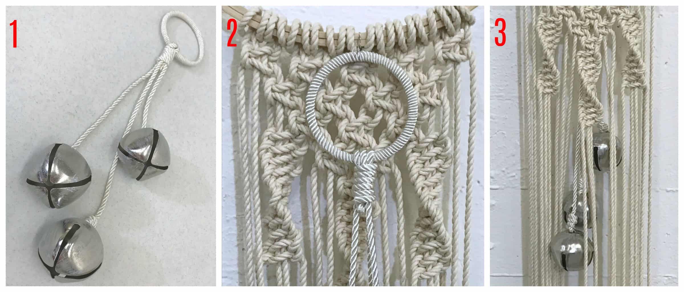 (1) strand of bells; (2) bells attached to back side of macrame; (3) view from the front