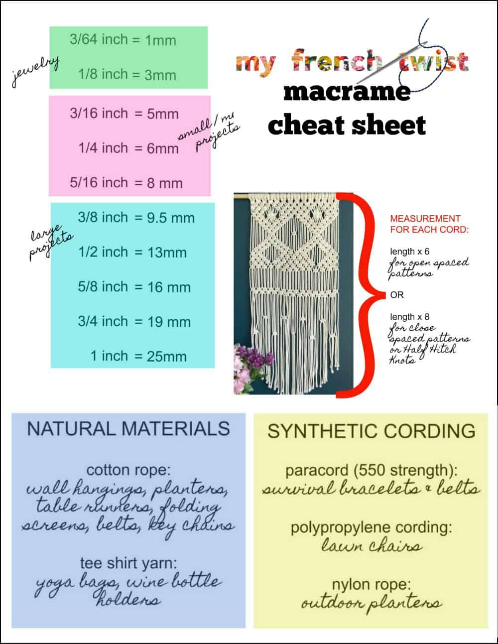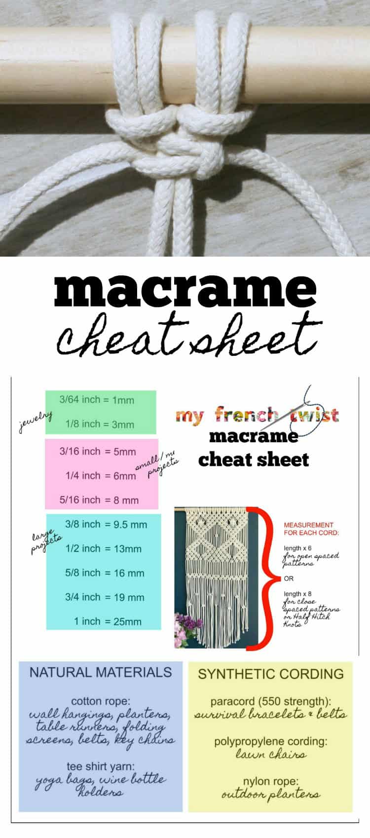 What length rope should I use for a project? This, my friend, is the million dollar question. Unfortunately, I don’t have a guaranteed formula for determining cord length, but I’ll share my personal guideline. If the macrame design uses doubled cords folding in half to form 2 cords (Lark’s Head Knots), then the rope pieces should be 8 times the length of the finished piece. This is true especially if the project has less open space and consists of knots that require lots of cording, such as Half Hitch Knots. If the piece uses lots of open spaces and less closed spaces, then 6 times the finished length is the rule. To download a printable version of the cheat sheet below, click here.