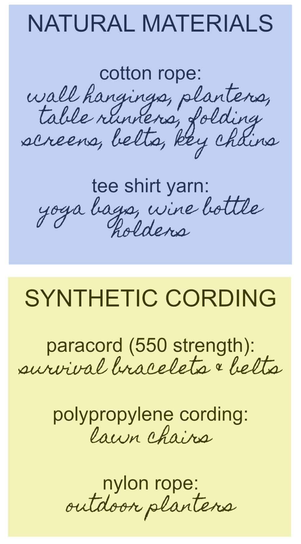 - Natural materials, such as cotton, wool and hemp work best for indoor projects. Cotton rope is my favorite for most items, such as wall hangings, table runners and belts.