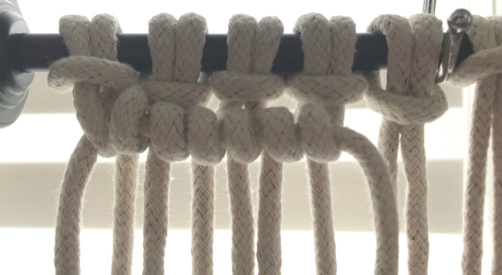 Using a Half Hitch Knot, begin with the first individual cord on the left and make an even row of knots across the entire width. I have both a written and video tutorial for making Half Hitch Knots.