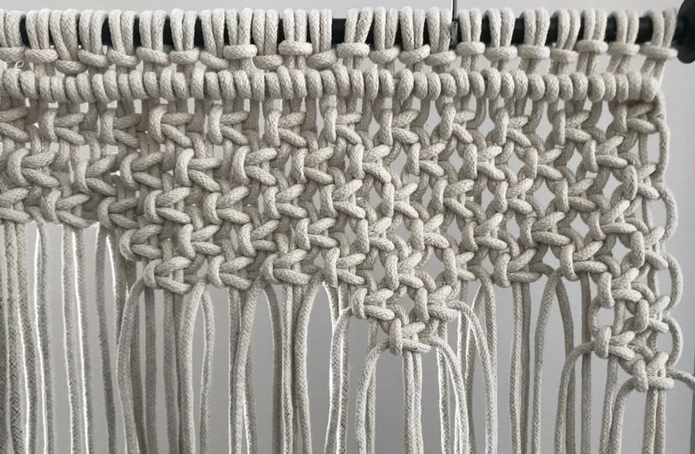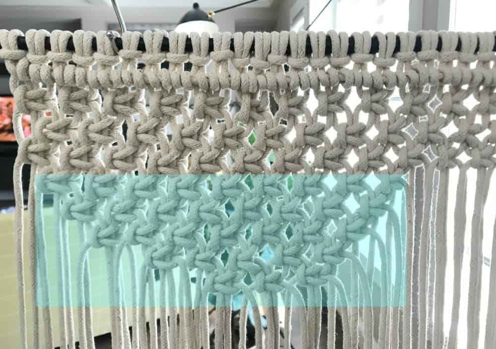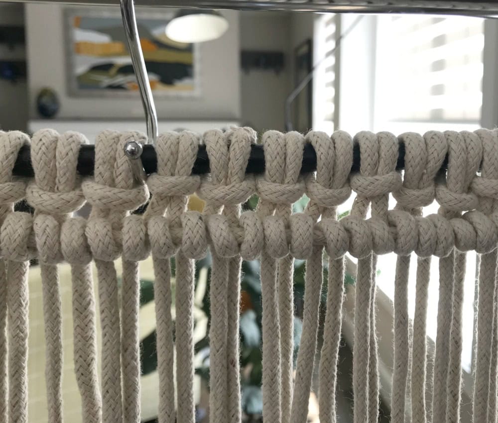 Cut 48 pieces of rope, each measuring 10 feet. Place a small piece of masking tape around each edge to prevent fraying while weaving. Tie each piece onto the rod using a Lark’s Head Knot. This curtain is made to fit a window 31″ wide; but you can adapt this pattern for a wider window. Just remember to use a total number of cords that are divisible by four; it makes your knotting go smoother.