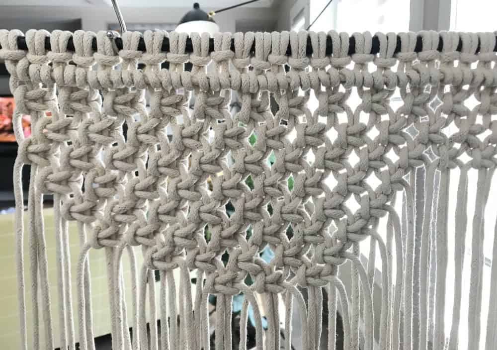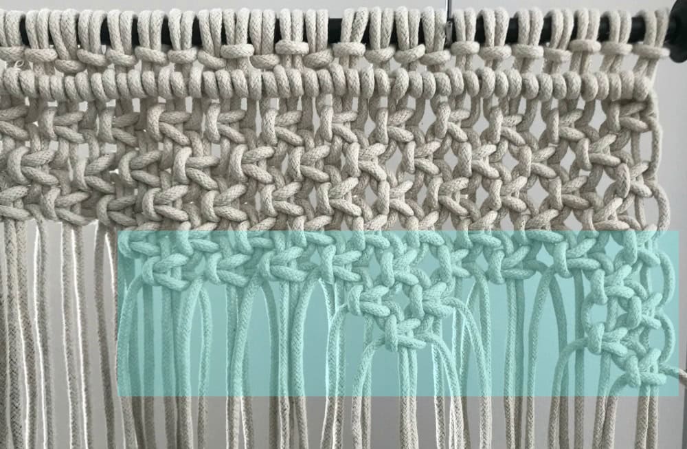 Normally, my macrame patterns include row by row instructions. However, this pattern is a bit more free form, and it is easier to work in sections than horizontal rows. It is also more forgiving if you miss a knot or make a small error. Now that you have 3 rows of Square Knots, continue adding more Square Knots and Alternating Square Knots to the left side of the tapestry, creating a round dipping form as shown in the photo below.