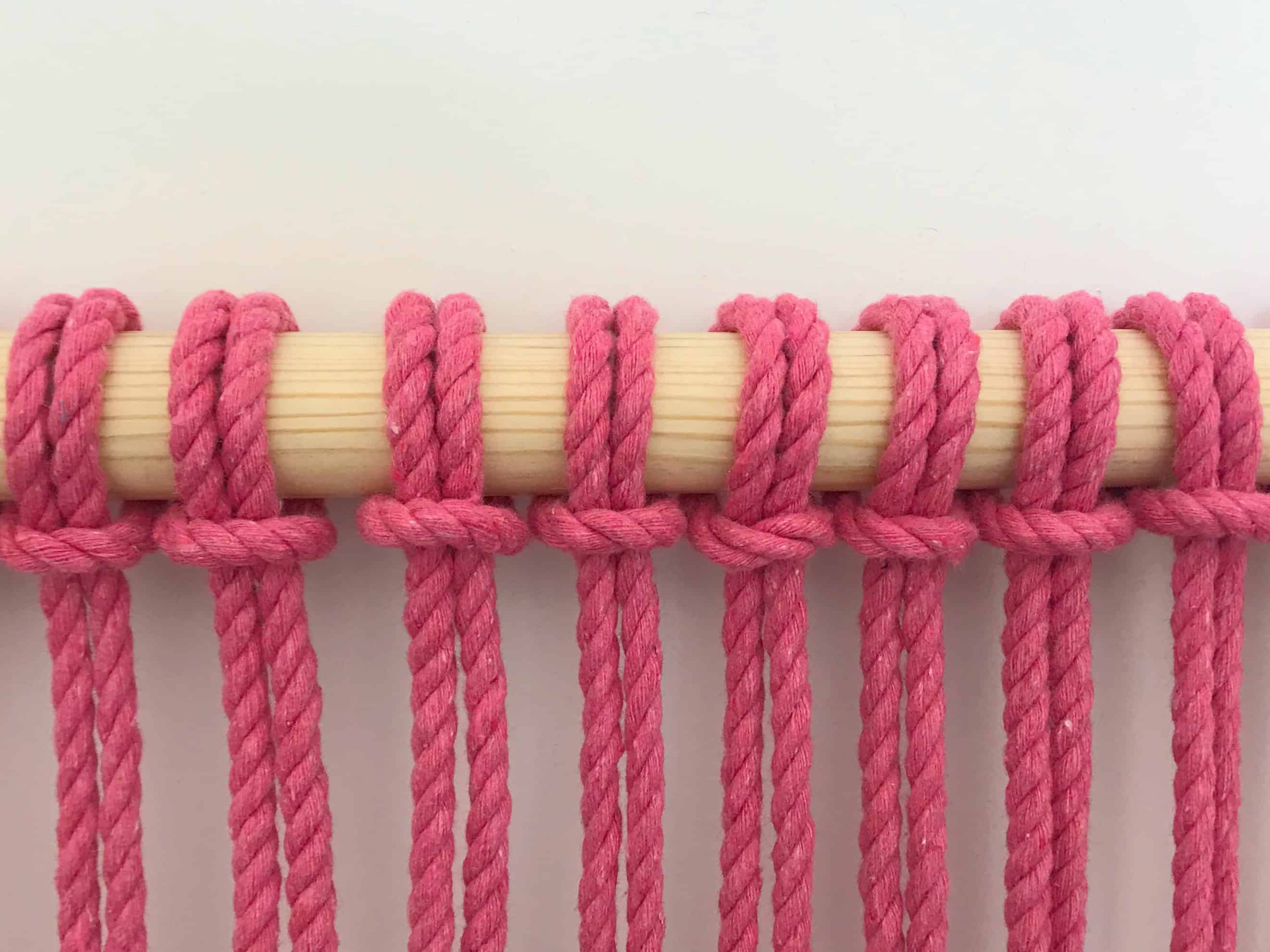 With the 16 pieces of rope, tie Lark’s Head Knots onto the pole, as shown below.