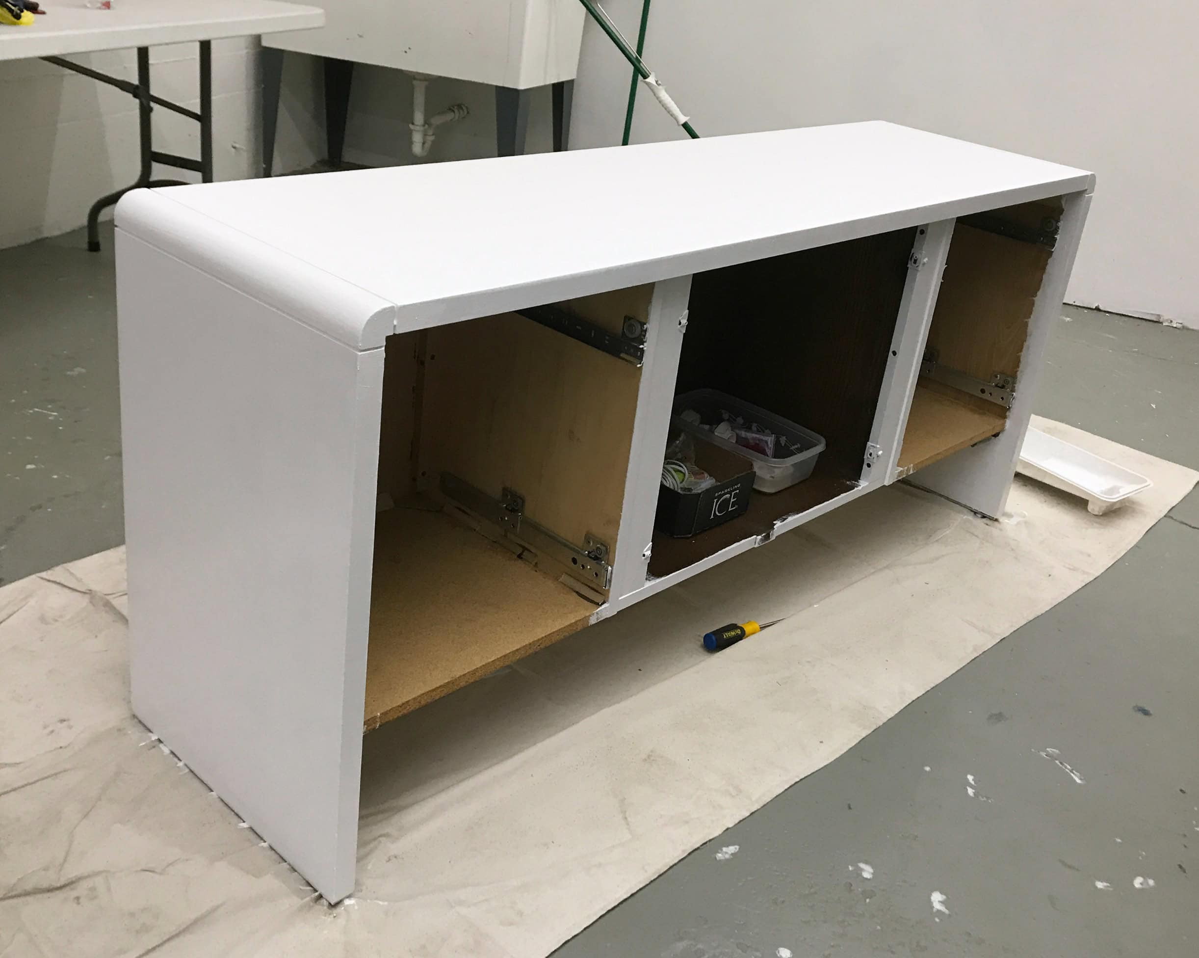I’m currently furnishing a new art studio on a very small budget, and this credenza is perfect for storage. So even though there’s plenty of tutorials to be found on restoring laminate and veneer furniture, I doubt there’s one with as cute of a model. So I must share.