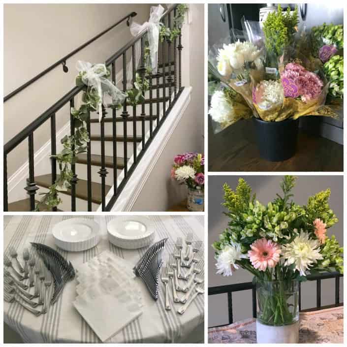 I kept decorations fairly simple, using ribbon and garland from my craft room stash and fresh flowers from the grocery store. I did, however, arrange the silverware in an eloquent fashion. Umm, did I say silverware? (Shh… they were plastic.)