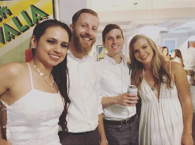 First, meet the guests of honor. The brides? One petite Brazilian wearing a bit of bling, and one rock-climbing bohemian carrying a bouquet of wildflowers. Both beautiful inside and out. The grooms? My son and his bride are on the right; his best friend & bride on the left.