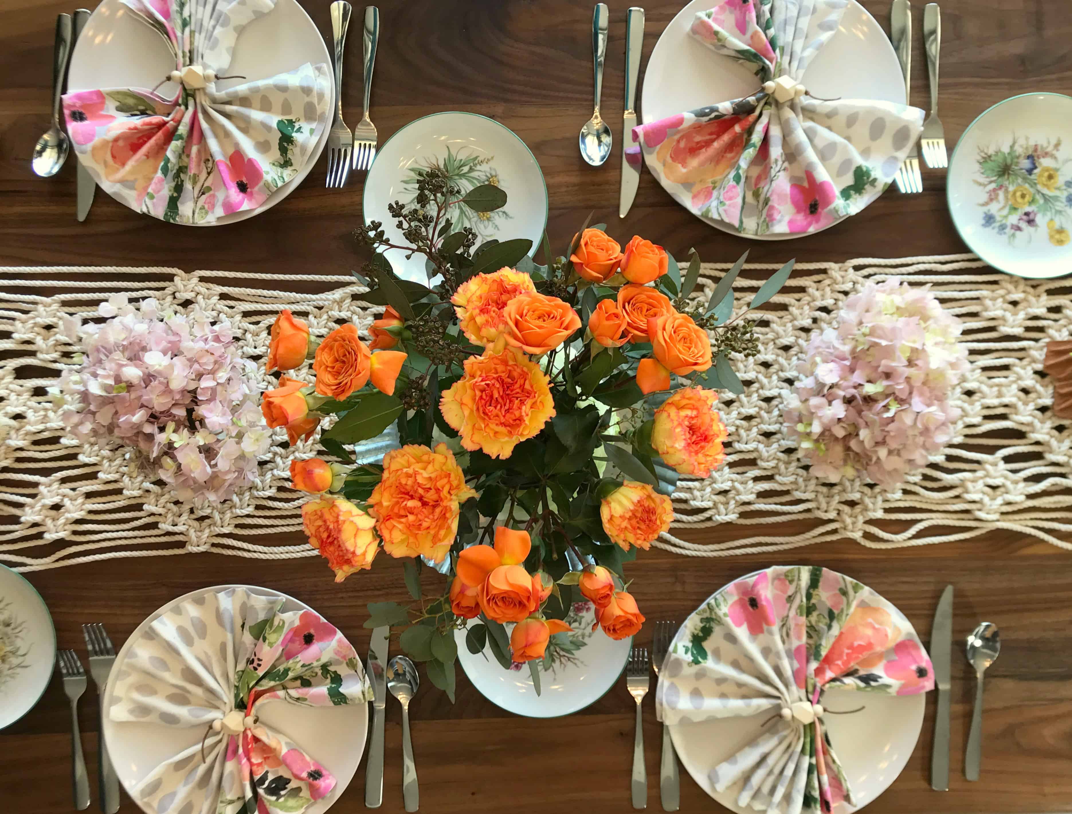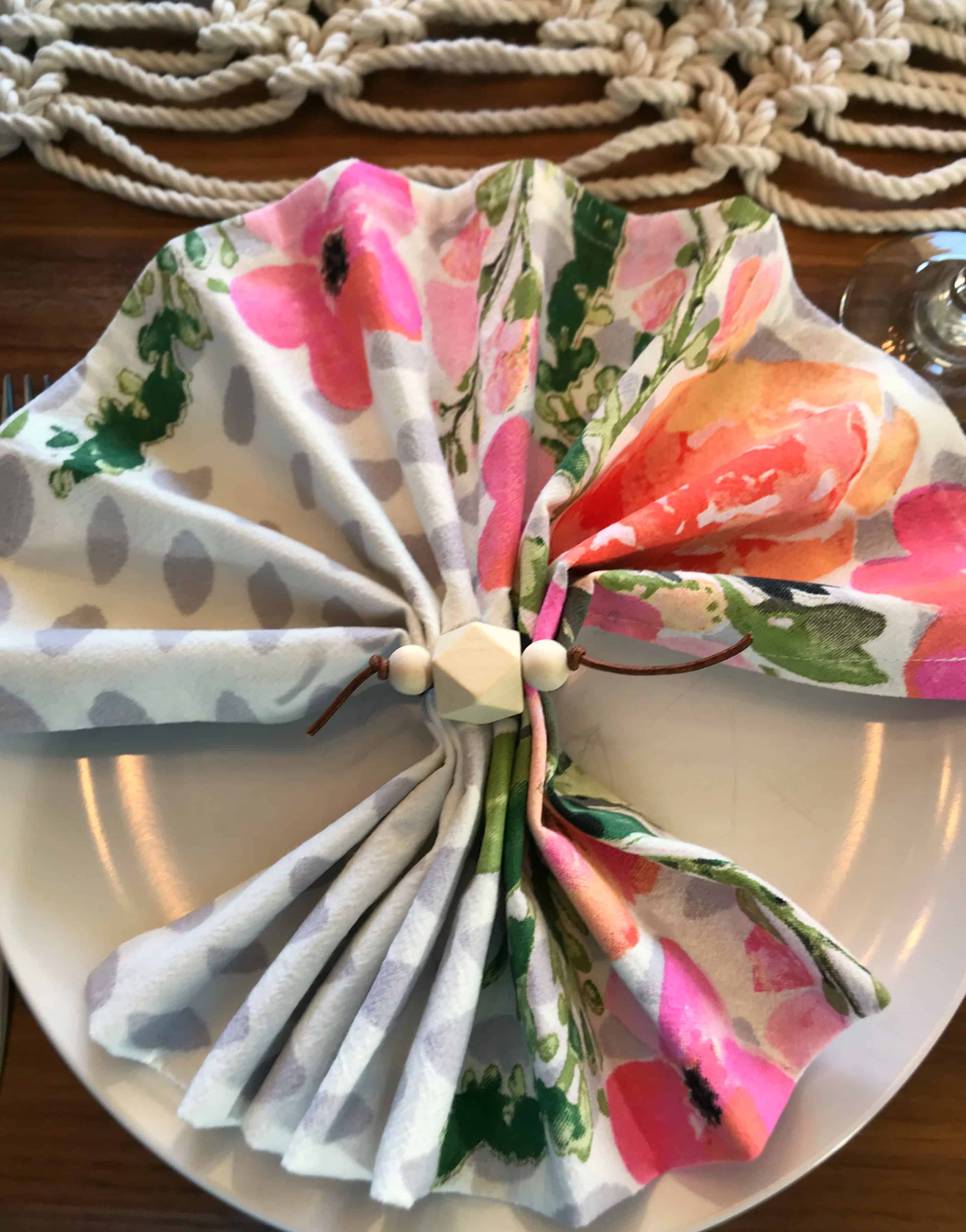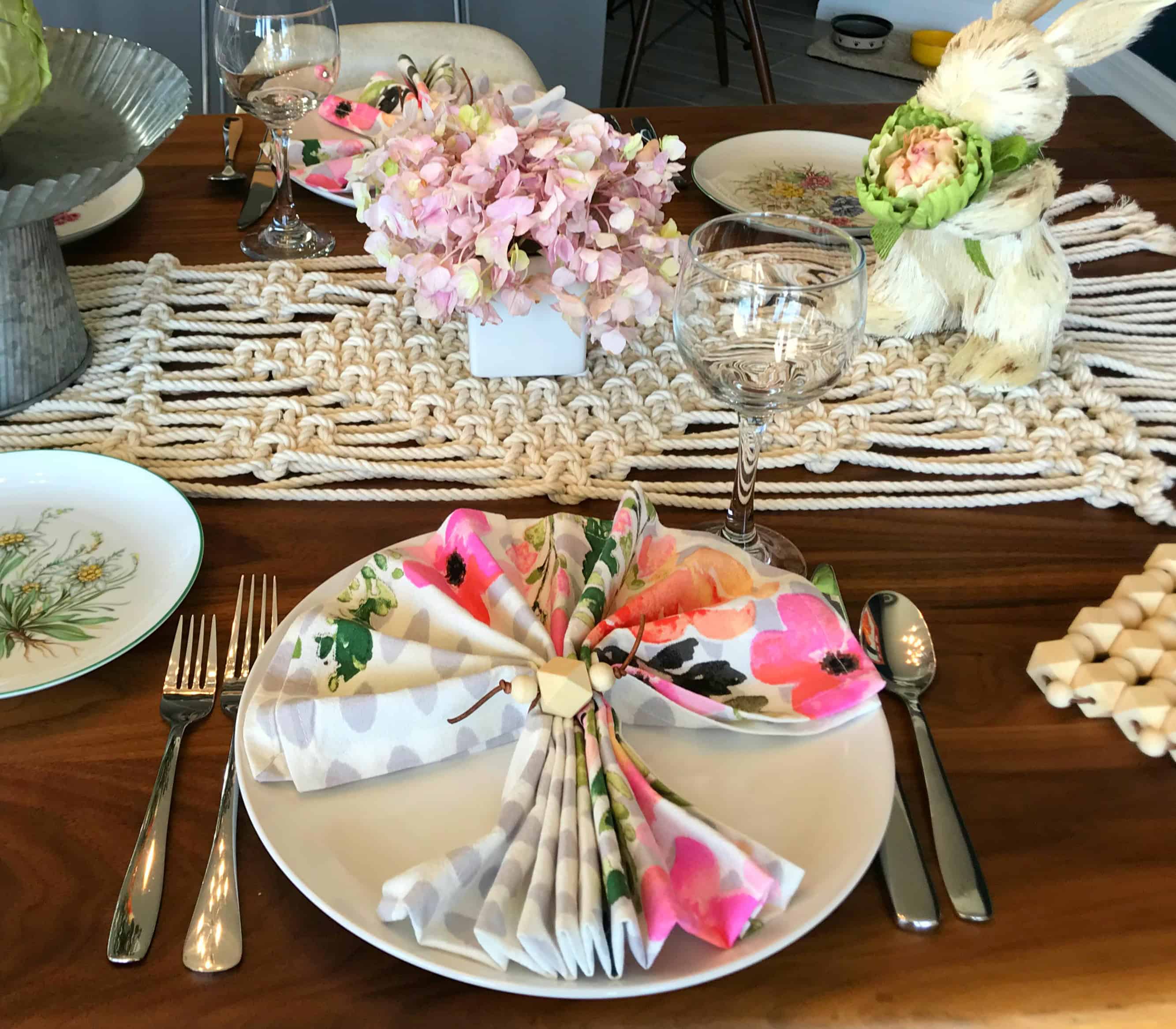 How creative to use cabbage as the centerpiece! Love it! The macrame table runner is the perfect touch. Love how you folded the napkins too – look like spring bouquets.