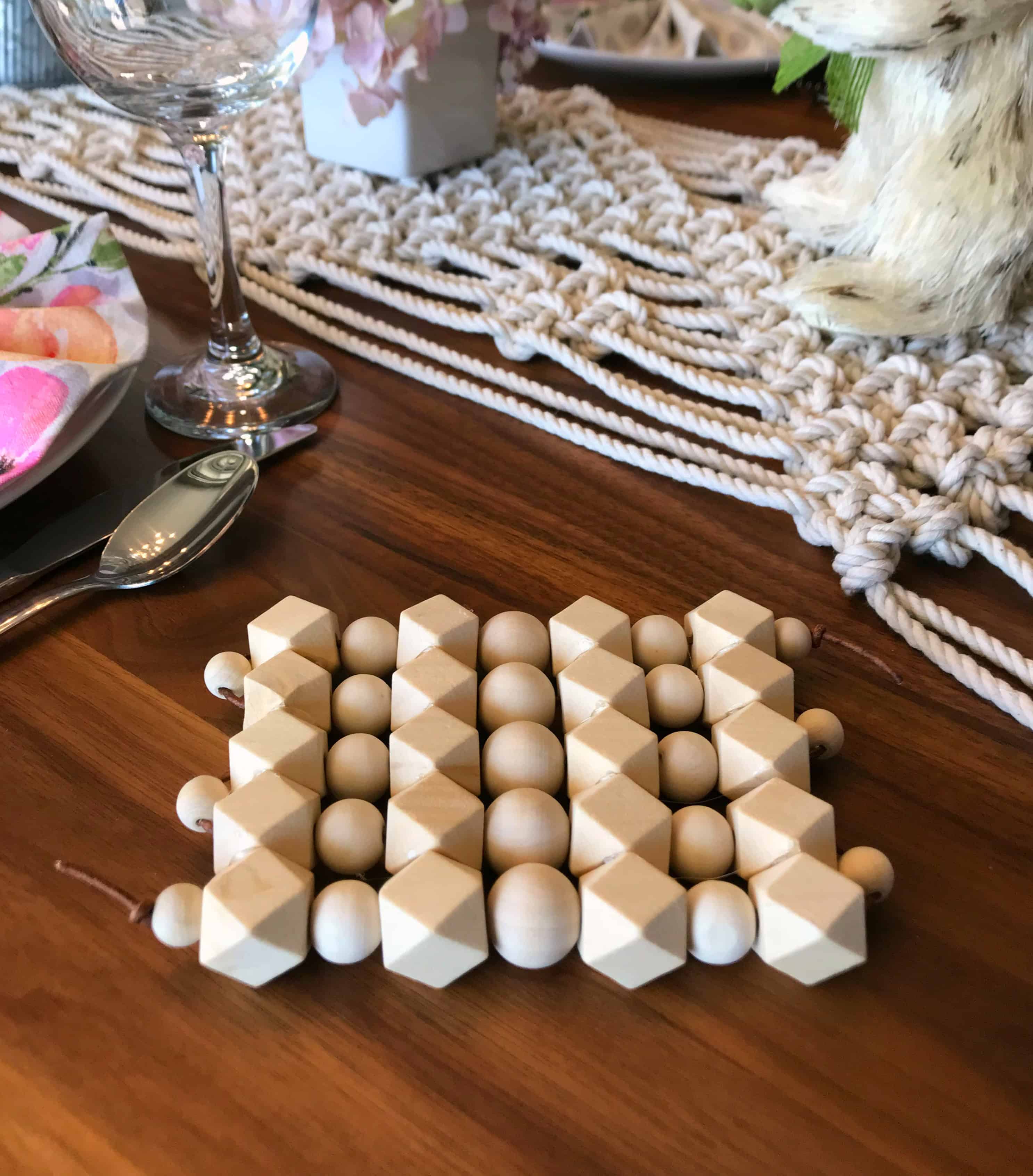 Wendy, your table is so unique and really goes to prove that when you love something, it will work in a table setting. I was so drawn to your macrame table runner. It really added so much texture to your table and your fanned napkins with the mix of floral and grey diamond pattern mirrored the module pattern in your macrame., trivet and beaded napkin rings. And who can’t resist your textured duck and bunny. So much fun going on.