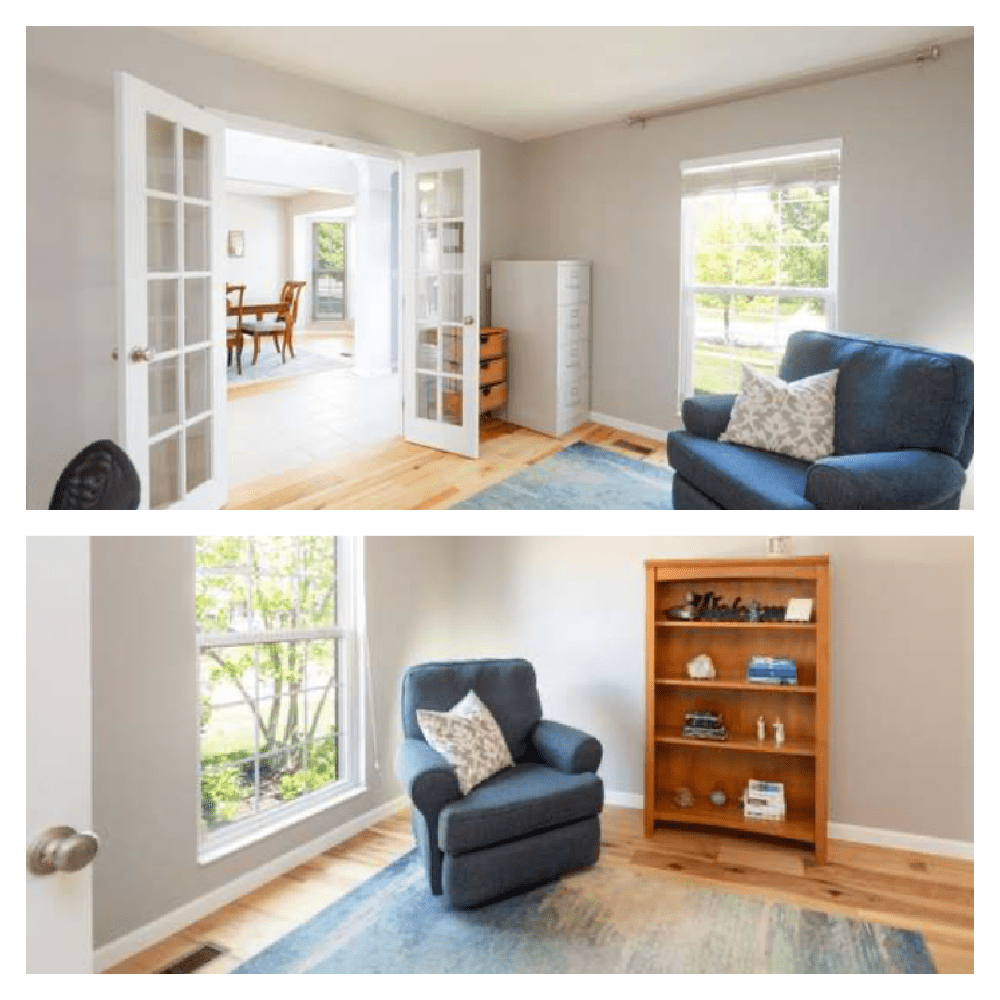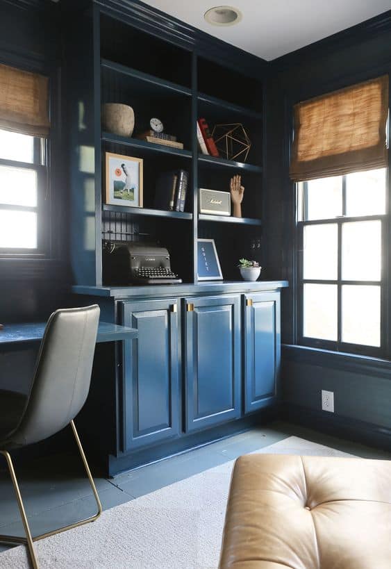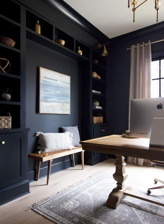 When selecting paint, people often just ponder the color they like. What they should be determining is the mood they desire. Lilly envisioned this small study as a cozy retreat from the rest of her sun-filled spacious house. A quiet and easy alcove. So naturally, a dark and moody color was the answer. From photos on her Pinterest board, it was clear she loved the feeling evoked by deep blues.
