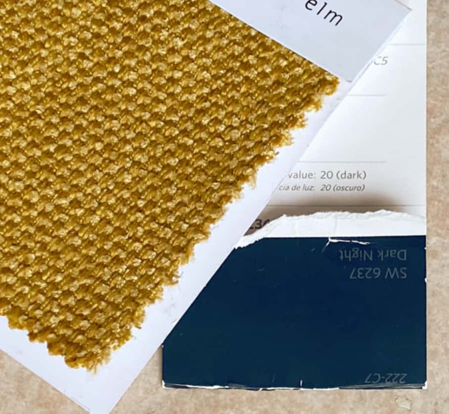 The vibrant gold fabric swatch pops lusciously when paired with the dark walls!