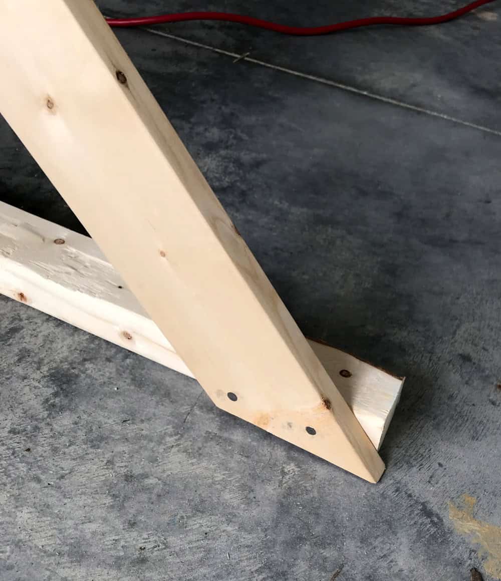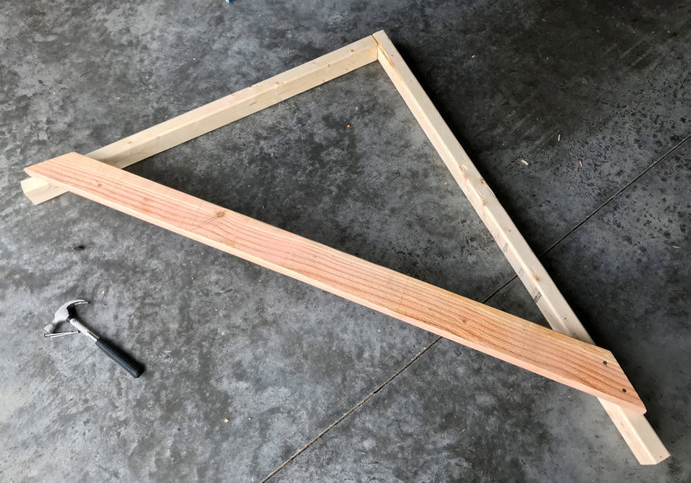 I bought most of the lumber at Home Depot, but because they don’t make speciality cuts for wood, I bought the 2 x 4s for the angled pieces from the local Ace Hardware. They cut the ends at 45 degree angles. Then I pieced the triangles together as shown below and used framing nails to put them together.