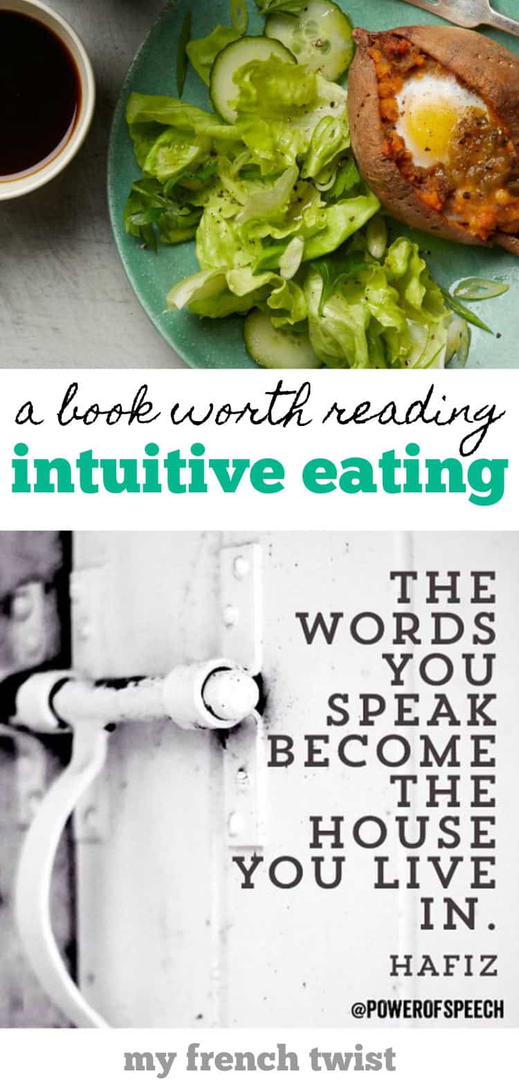 You see, I’m the queen of body-shaming. I’ve been so preoccupied with the numbers on the scale that I’ve reminded myself daily that I’m ugly. Fat. Unworthy. I didn’t even realize I was speaking self-degrading comments. Until I saw this quote and realized that I’ve built my house with words of hate. So in a last-ditch “dieting” effort, I visited a nutritionist. And she suggested I read the book Intuitive Eating by Evelyn Tribole.
