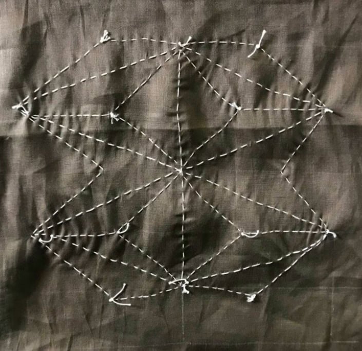 In traditional sashiko, there are specific methods for ending your stitches. But the title of this post is Sashiko Embroidery Demystified, so I’m here to tell you to keep it simple. I’m demystifying. You can just use basic knots, as seen below, to secure your threads. The beauty happens when you turn the cloth over to view the finished design.