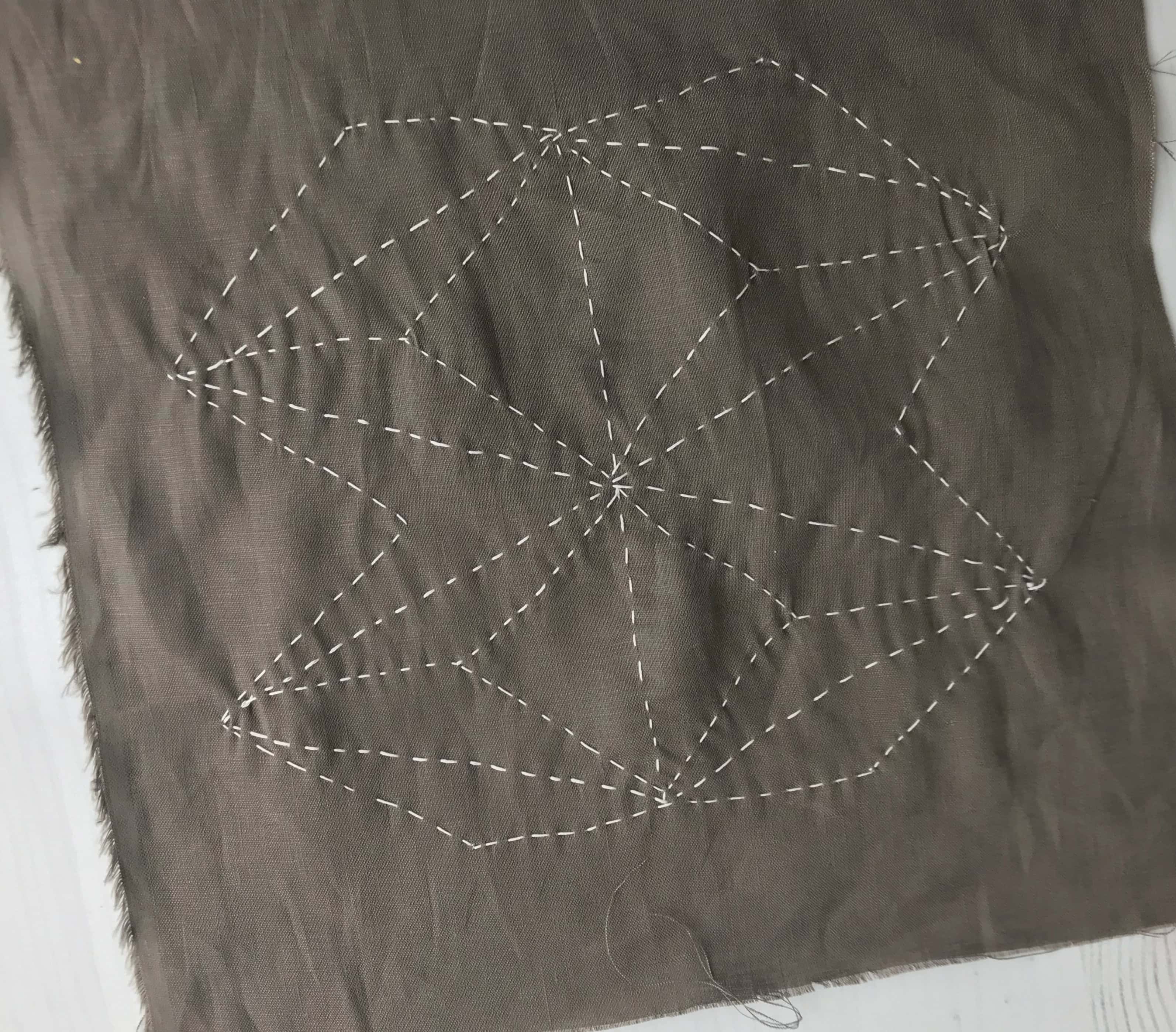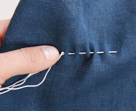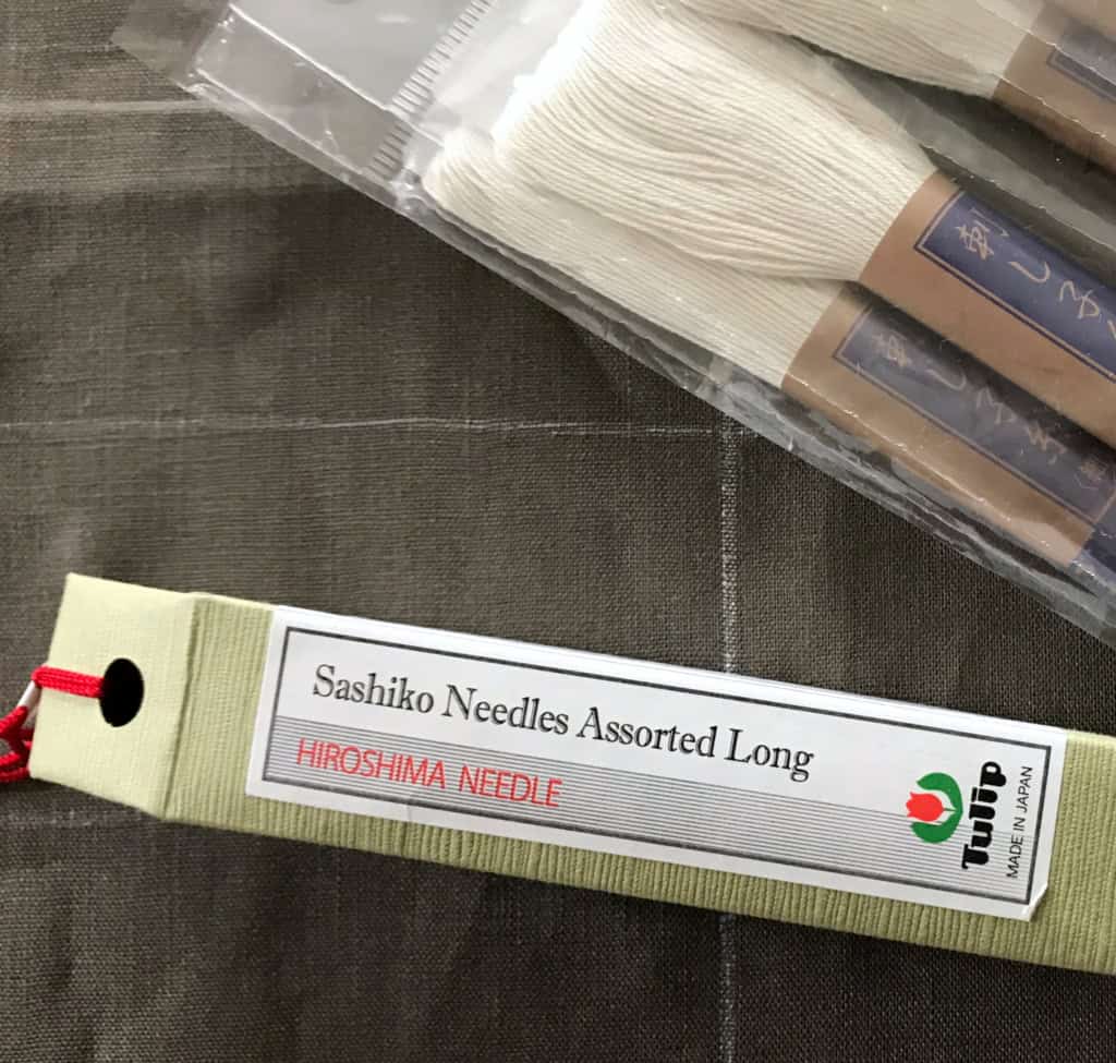 Sashiko is not sewed one stitch at a time; rather, you should “load’ the needle with stitches in a pleating motion. Several stitches are loaded onto the needle before the thread is pulled through. This helps to keep all stitches a consistent length.